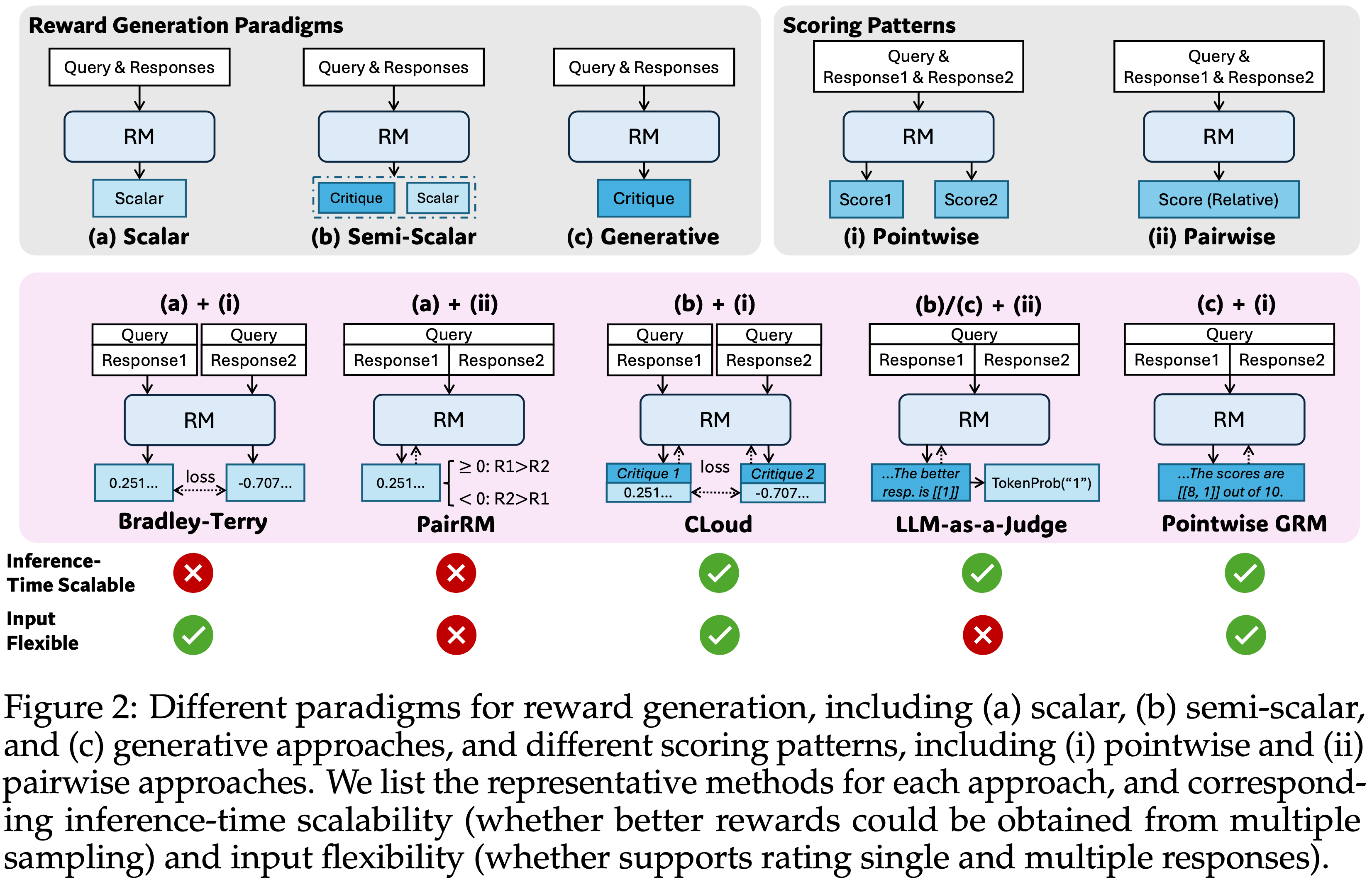 - 如图 2 所示,RM 方法主要由奖励生成范式和评分模式决定,这本质上影响了 RM 的推理时扩展性和输入灵活性