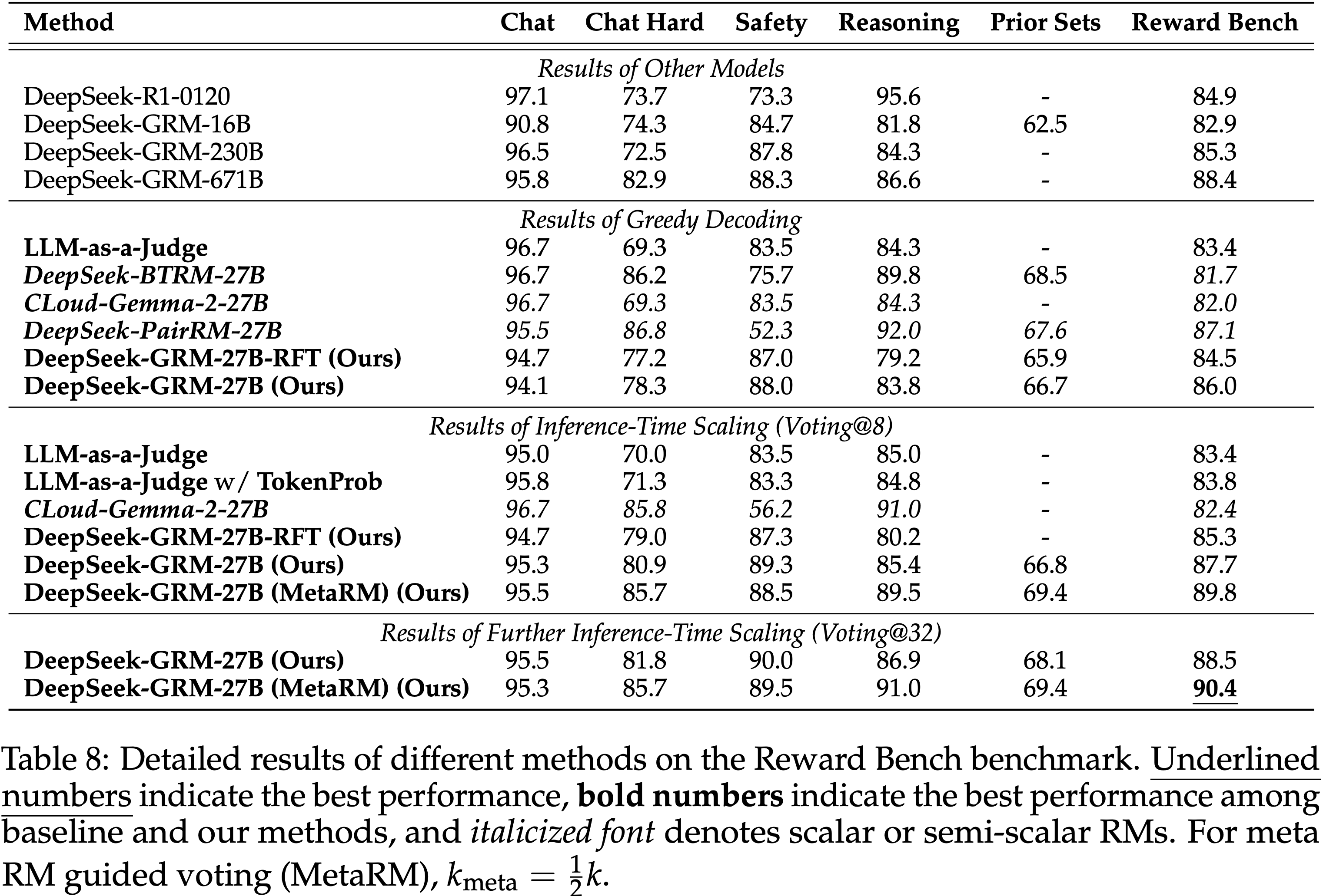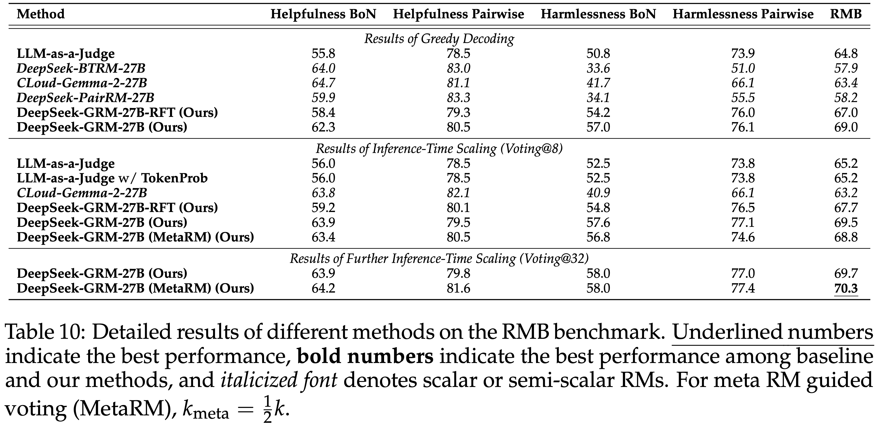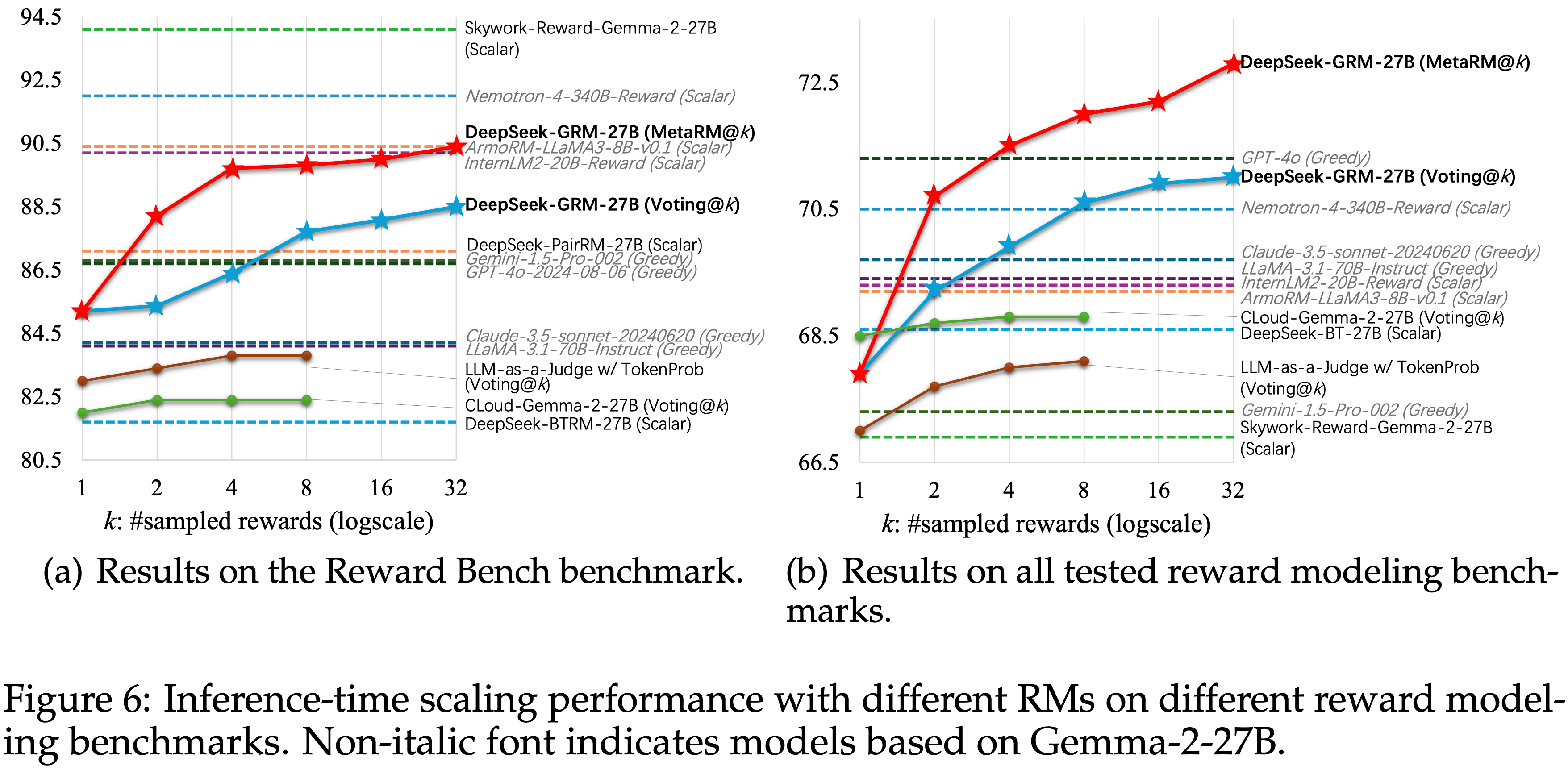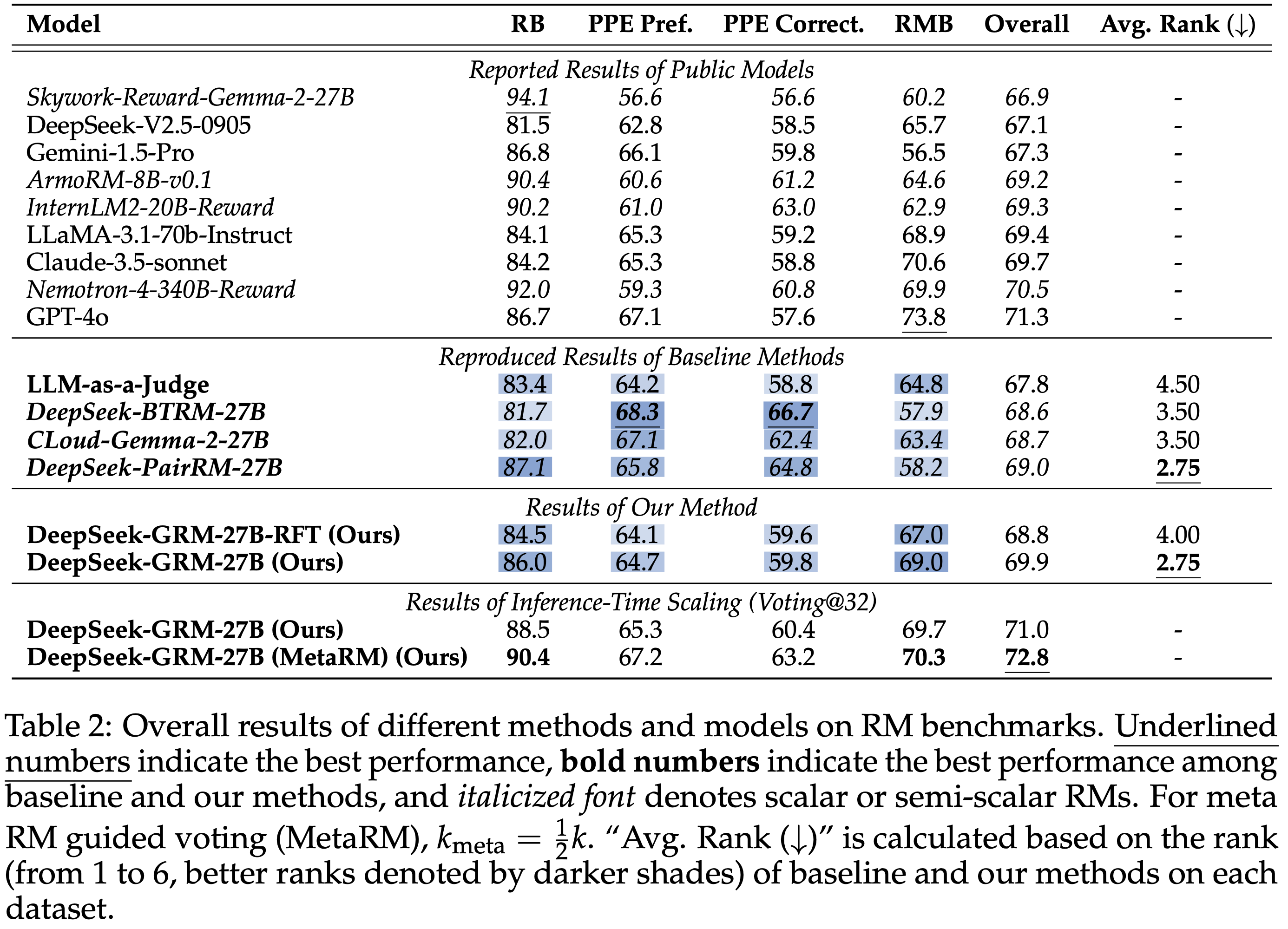 - 在实验中,DeepSeek-GRM 超越了基线方法和一些强大的公开 RM,并通过推理时扩展,尤其是在 Mata RM 的引导下,展现出显著的改进