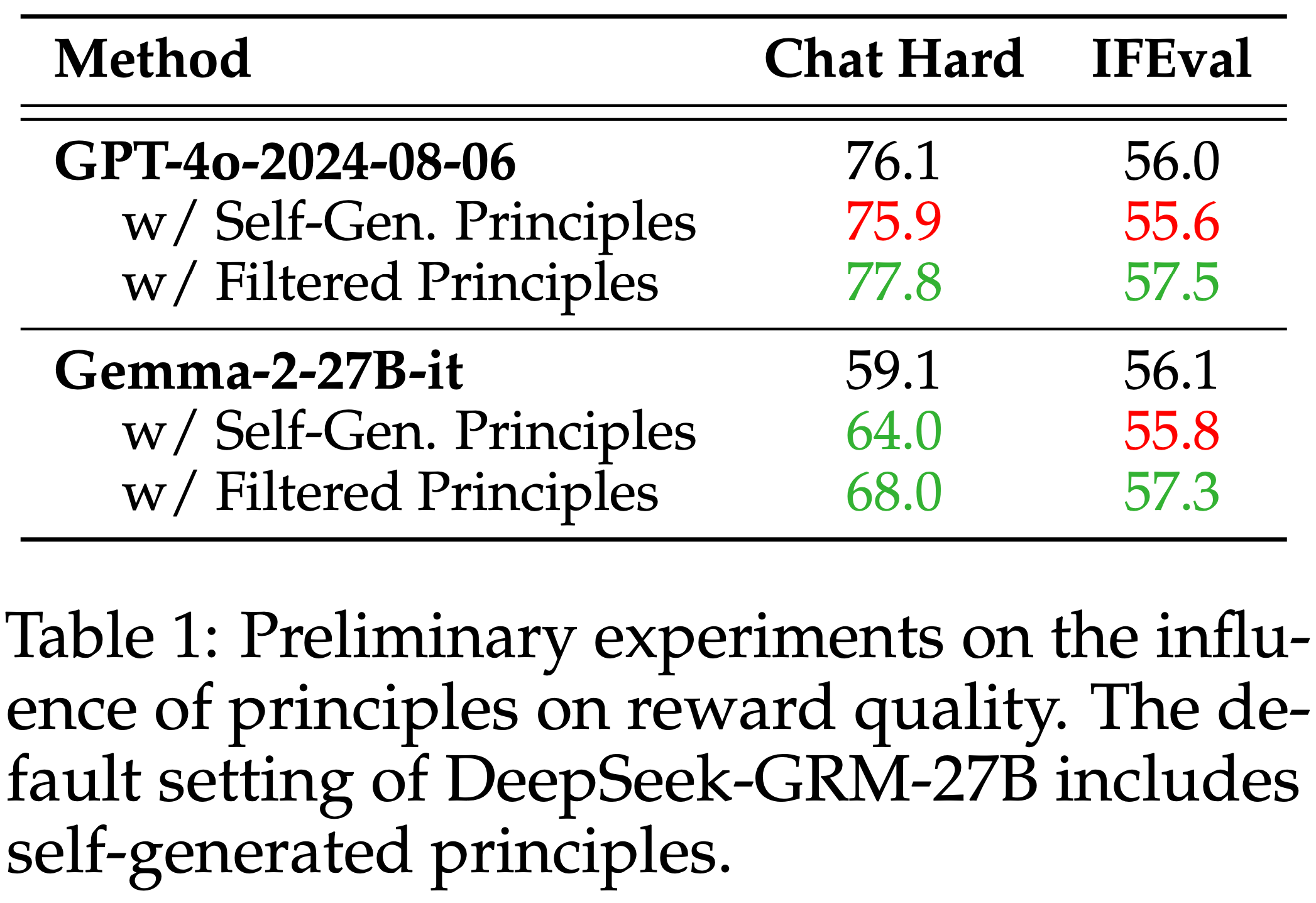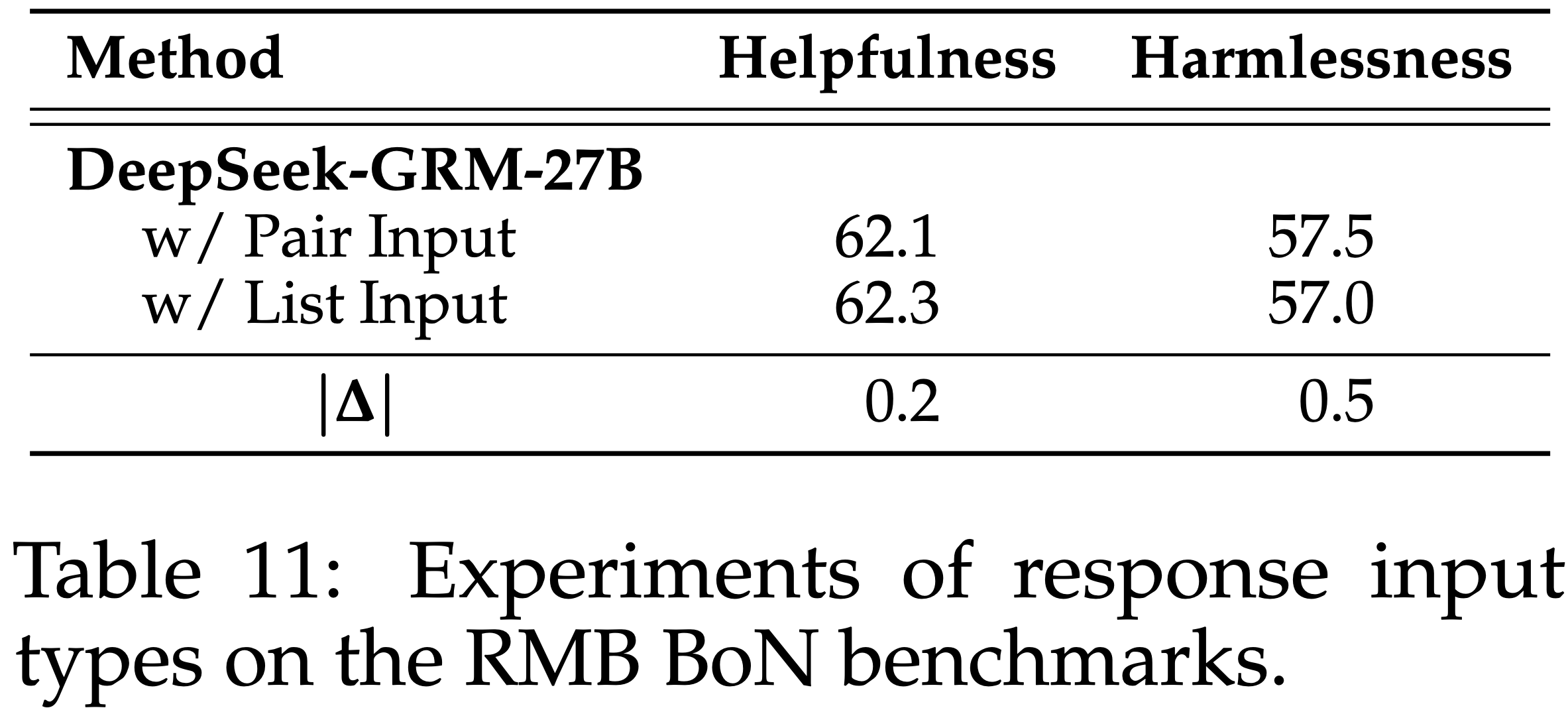 - DeepSeek-GRM 的用法看看附录 G 中 DeepSeek-GRM (Default) Prompt 细节更容易理解