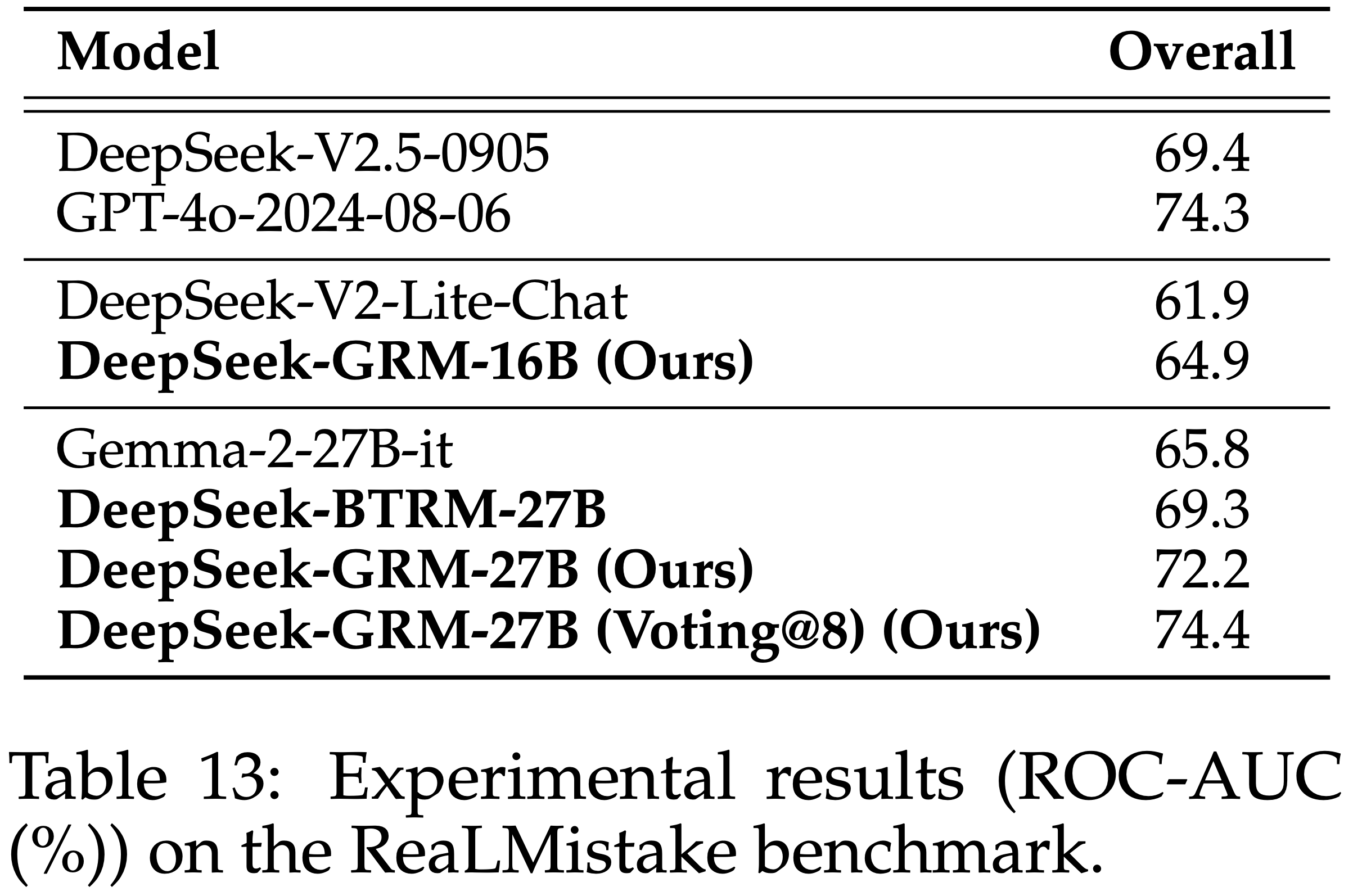 - 然后论文推出了 DeepSeek-GRM-27B ,它是基于 Gemma-2-27B (2024) 使用 SPCT 进行后训练的