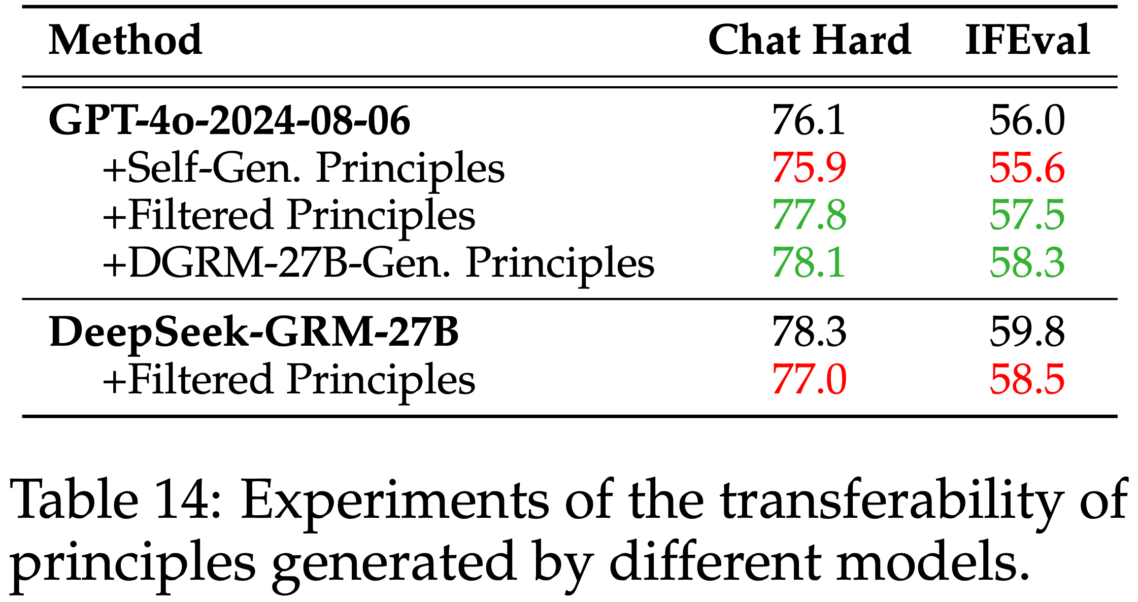 - 论文探索了某些 Principle 可以在适当的准则范围内指导 GRMs 的奖励生成,从而提高奖励质量,这表明 RM 的推理时扩展性可能通过扩展高质量 Principle 和准确 Critique 的生成来实现