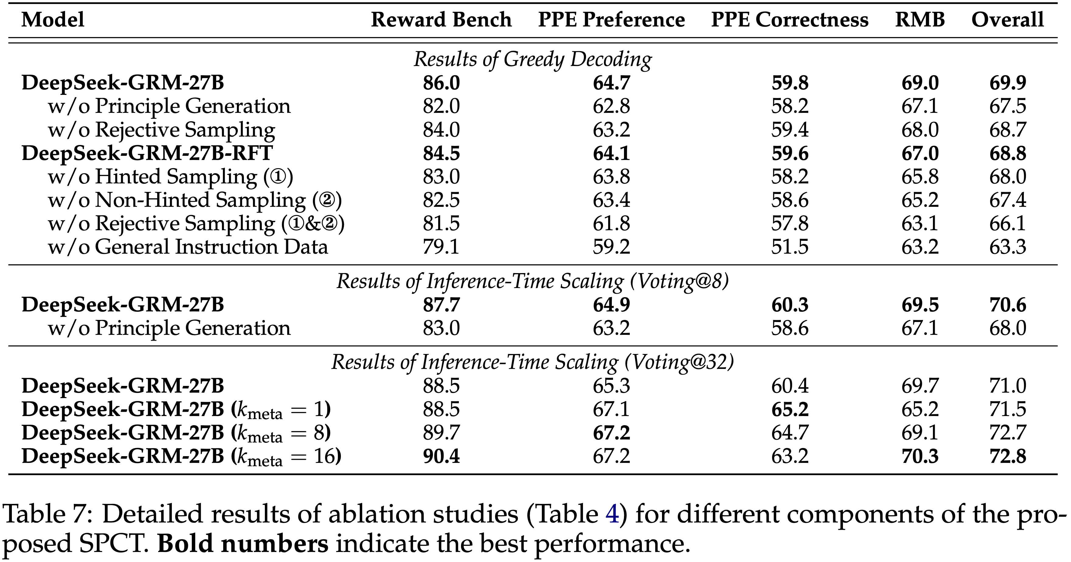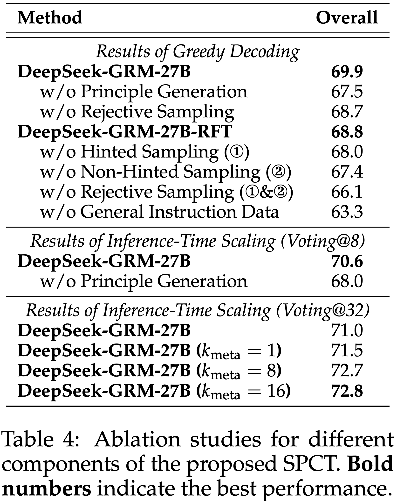 - 通过并行采样,DeepSeek-GRM 可以生成不同的 Principle 集和相应的 Critique ,然后投票决定最终奖励