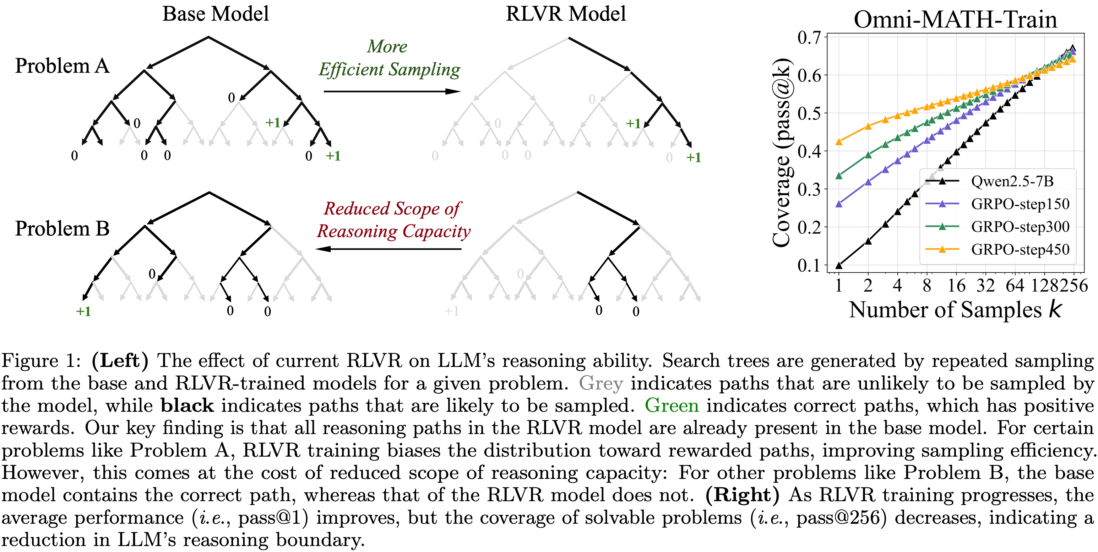 • 对于某些问题,如问题 A,RLVR 训练使分布偏向奖励路径,提高了采样效率