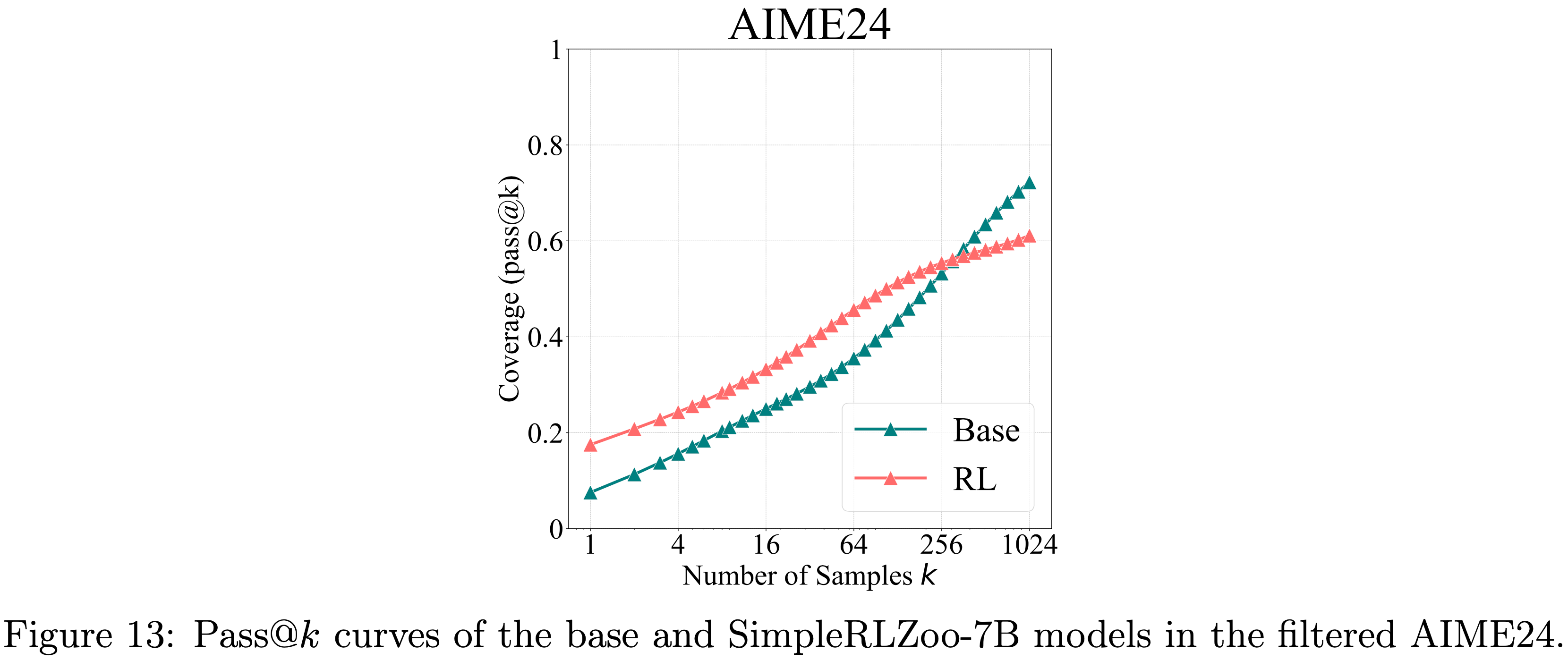 • Base Model 和 RL 模型在这个经过过滤的 AIME24 数据集上的 pass@\(k\) 曲线在图 13 中,显示出与之前结果相似的趋势