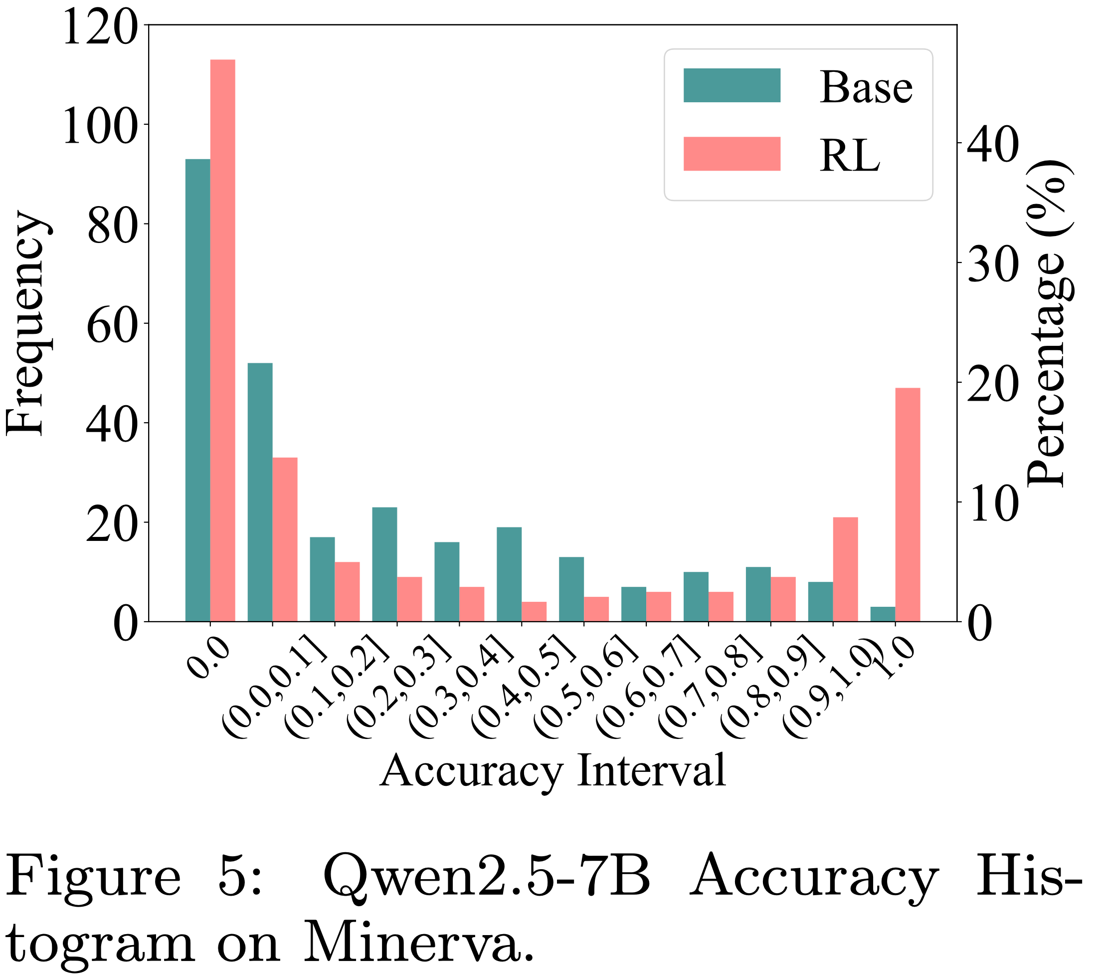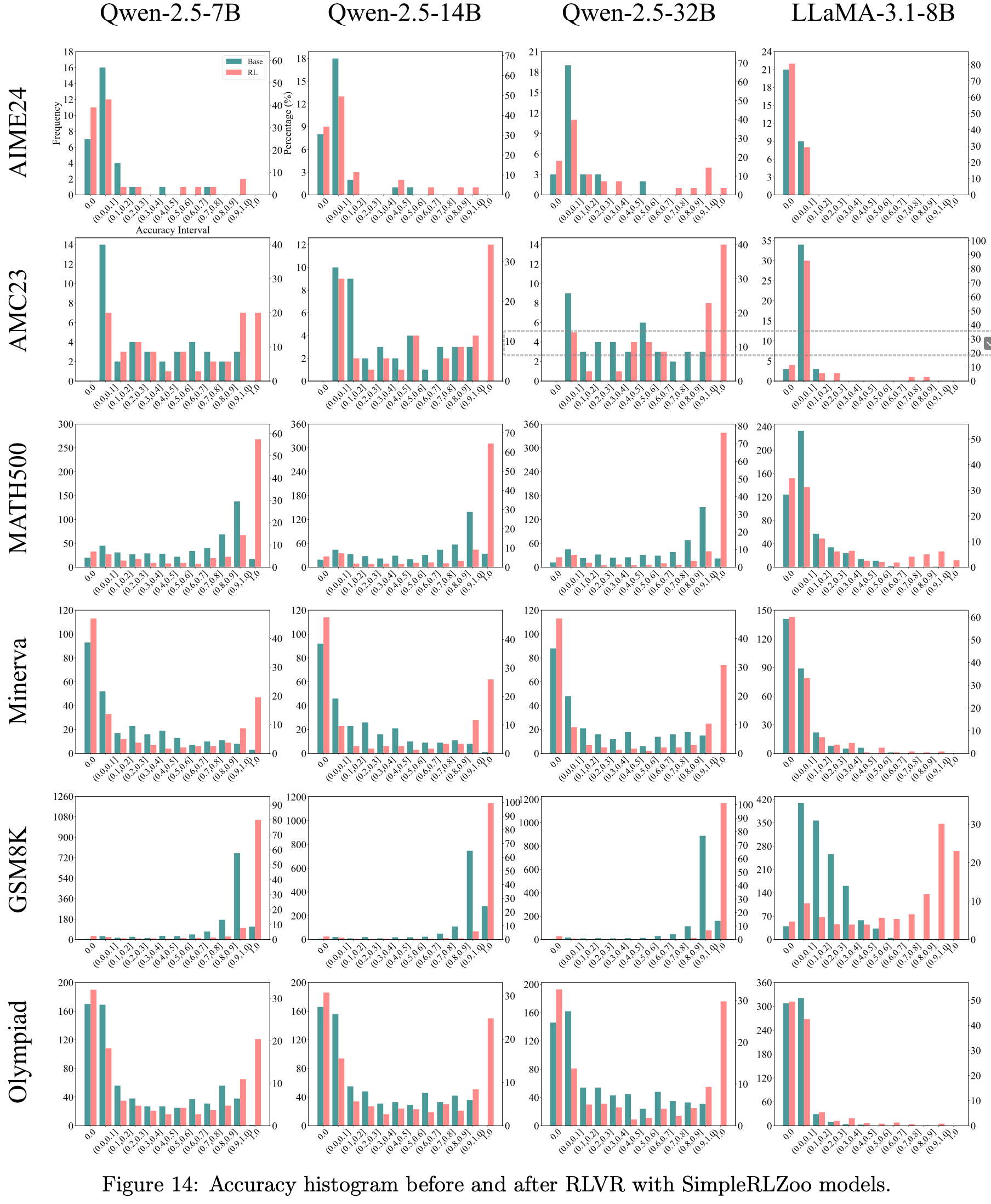 • 图14:在使用 SimpleRLZoo 模型进行 RLVR 训练前后的准确率直方图