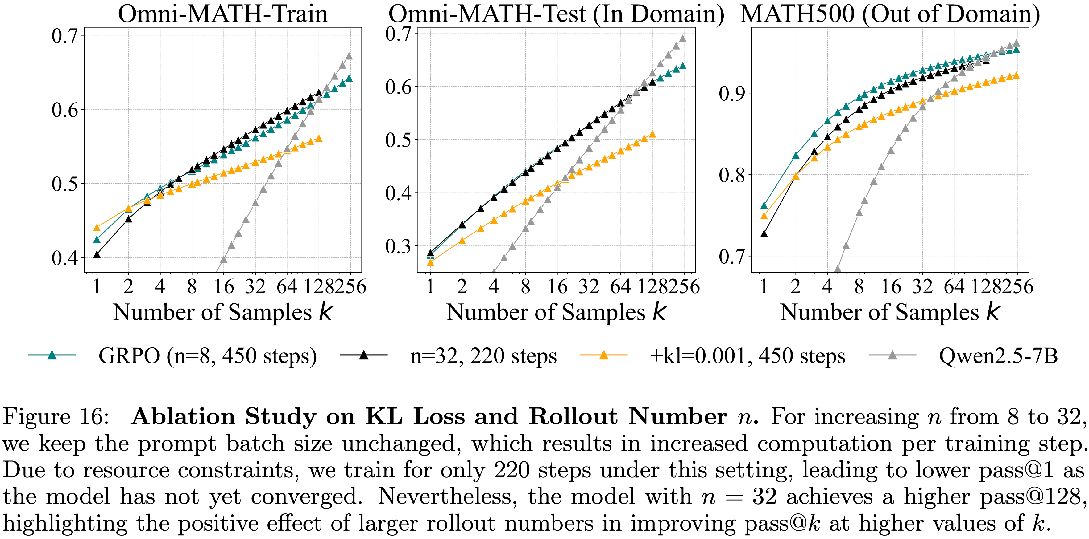 • 尽管如此,\(n=32\) 的模型实现了更高的 pass@128,突显了较大的 Rollout Number 在提高较大 \(k\) 值时的 pass@\(k\) 性能方面的积极影响