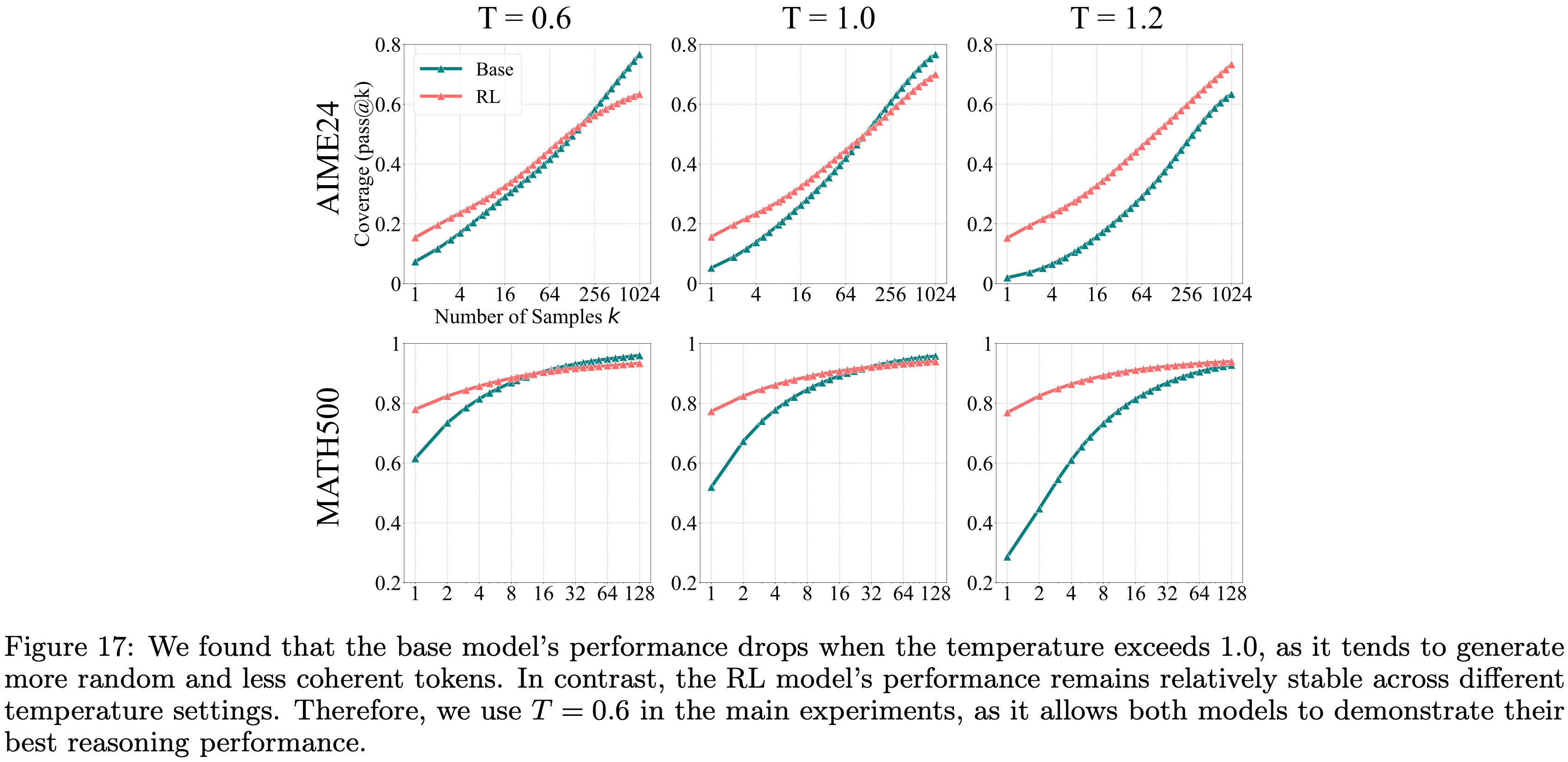• 图17:论文发现当温度超过 1.0 时, Base Model 的性能会下降,因为它倾向于生成更随机、更不连贯的 Token