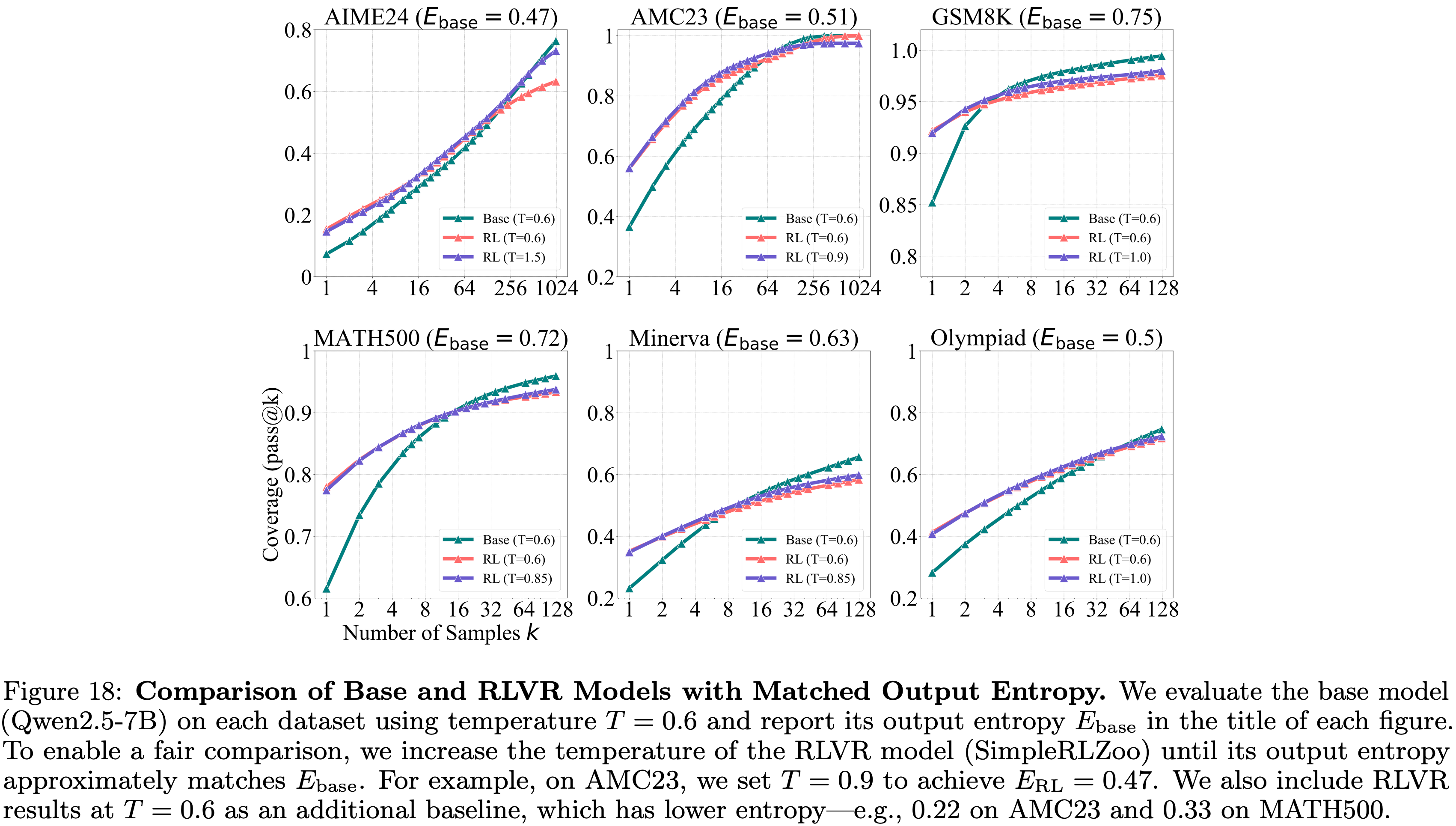 • 为了进行公平比较,论文增加 RLVR 模型 (SimpleRLZoo) 的温度,直到其输出熵近似匹配 \(E_{\text{base} }\)