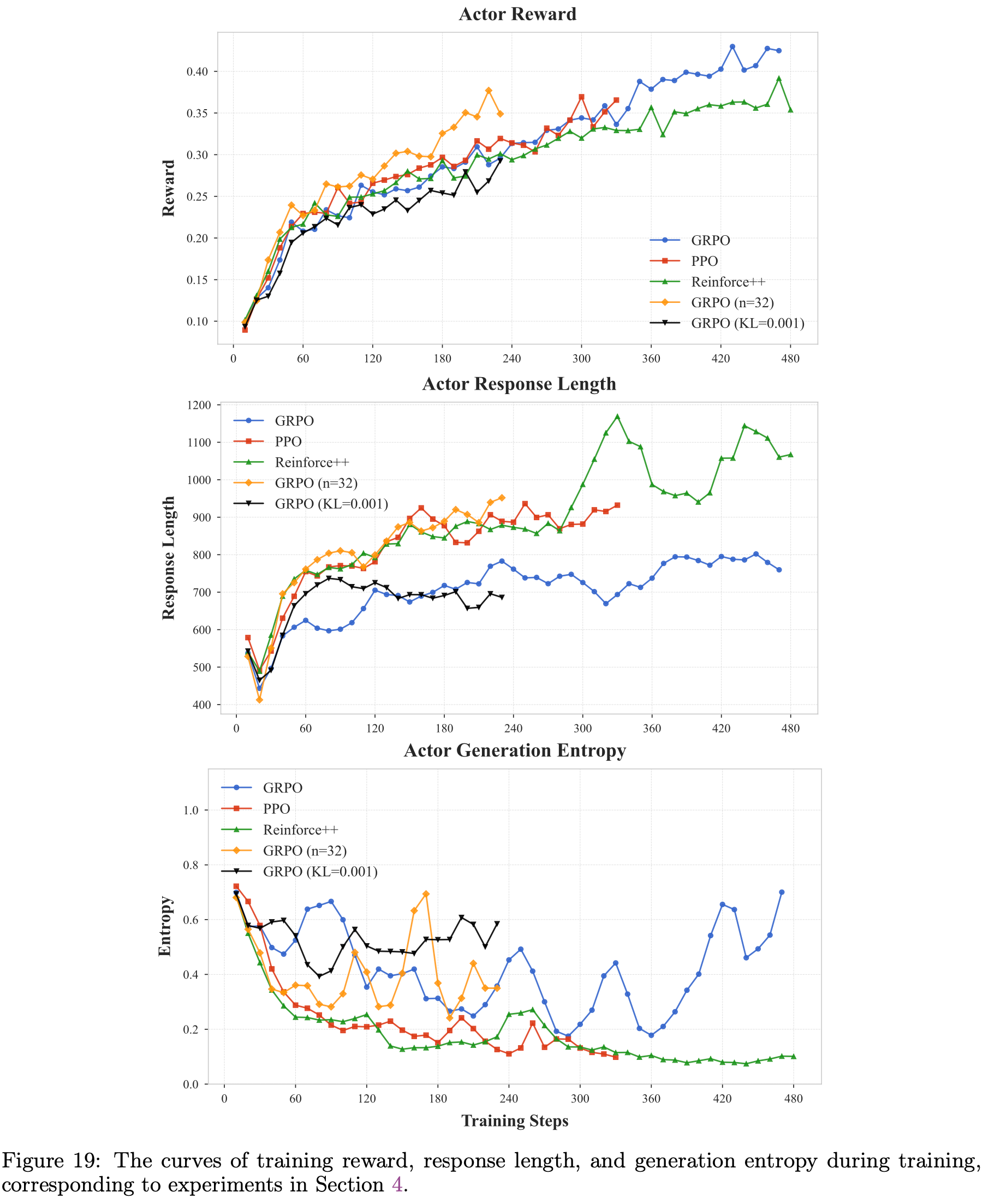 • 图19:训练过程中的训练奖励、 Response 长度和生成熵曲线,对应于第 4 节的实验