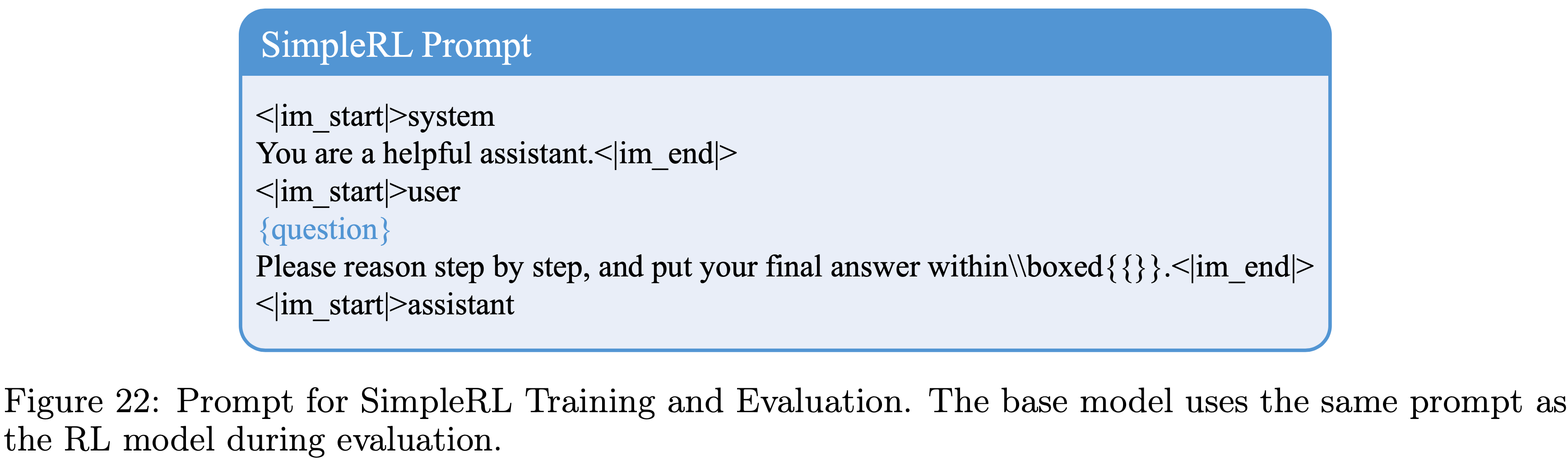 • 用于 SimpleRL 训练和评估的 Prompt 如图 22 所示