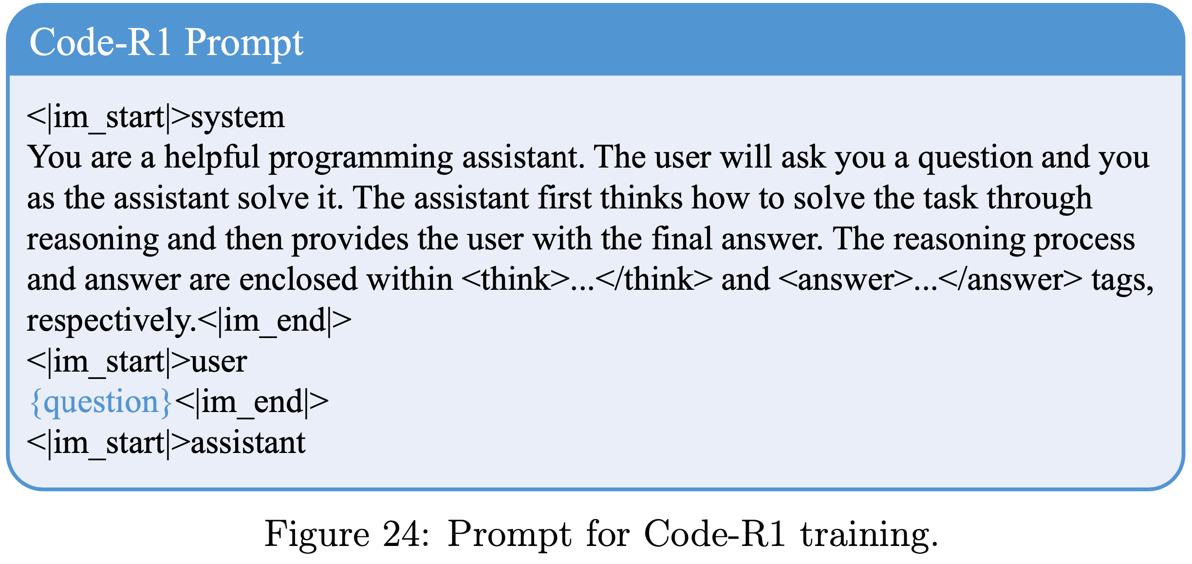 • 对于 Code-R1 训练,采用图 24 中的 Prompt