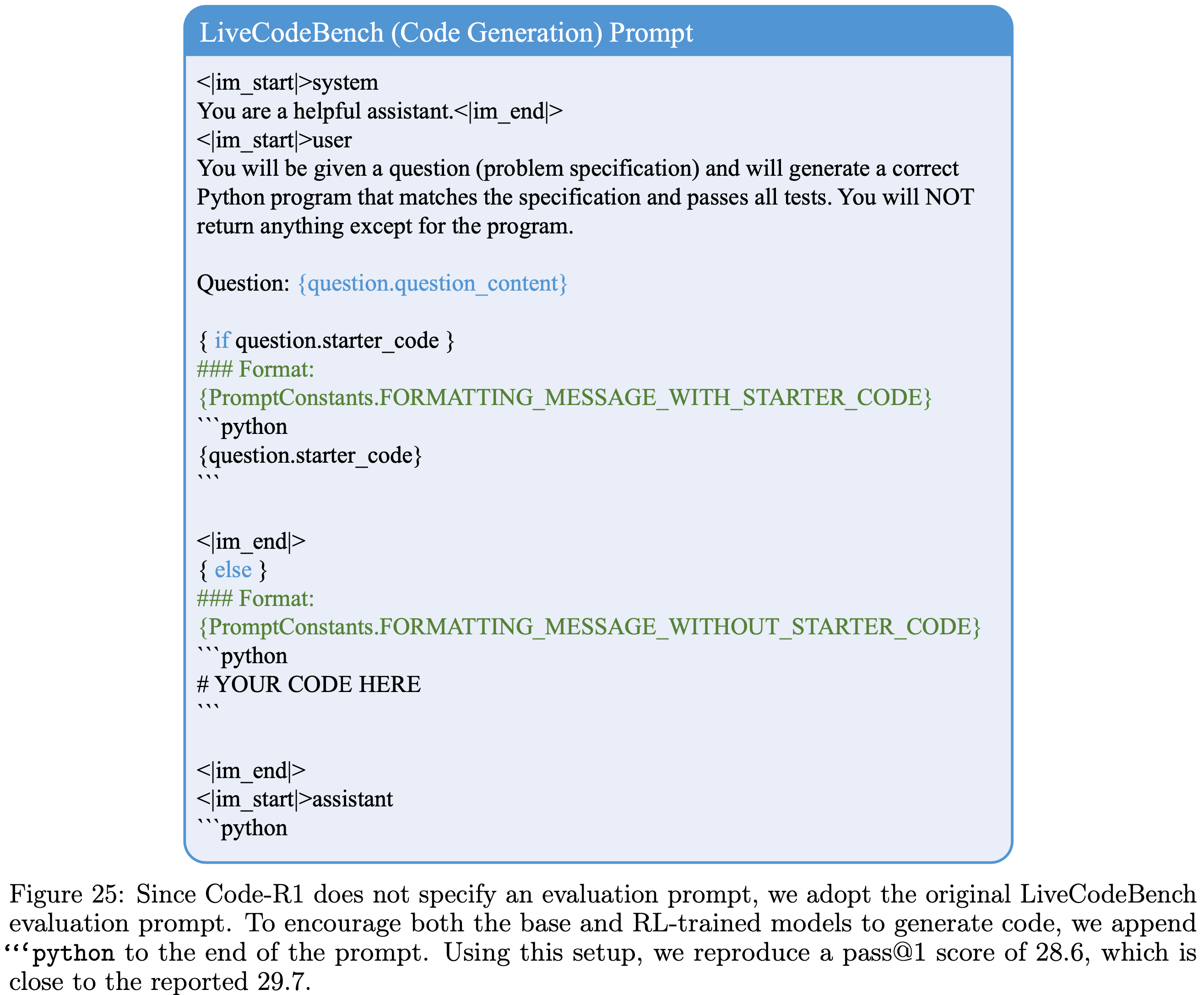 • 对于 Code-R1 评估,论文遵循原始代码库,并采用基准测试的默认模板(核心:LiveCodeBench 需要添加 Prompt “```python” 作为结尾),包括 LiveCodeBench Prompt (图25)、HumanEval+ 和 MBPP+ Prompt (图26)