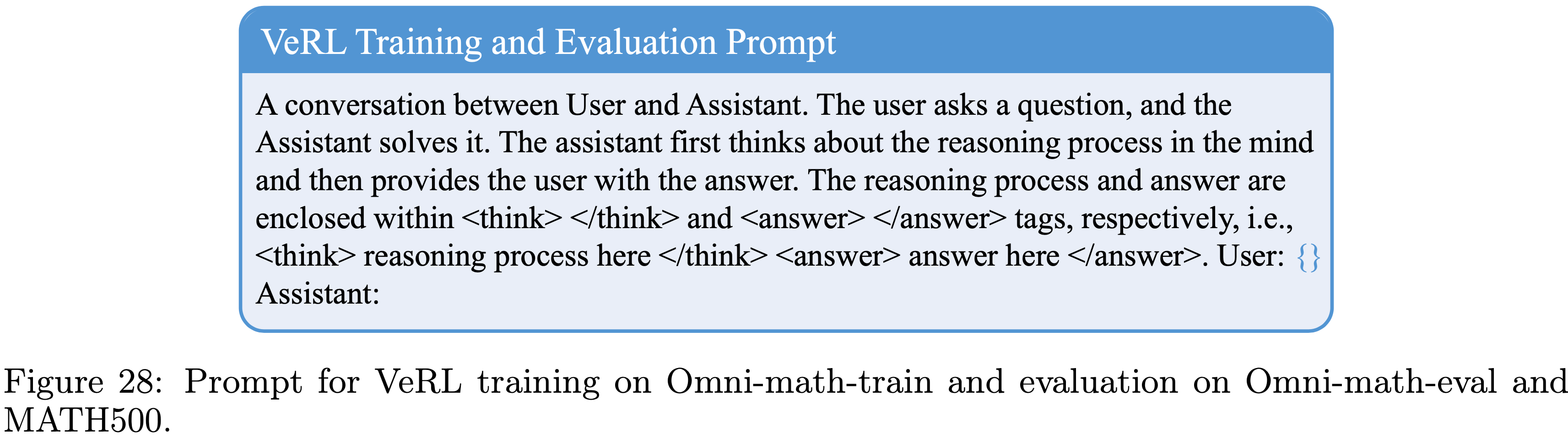 • 对于使用 VeRL 训练的 RL 模型,如第 4.3 节和第 4.4 节所讨论的,训练和评估 Prompt 如图 28 所示