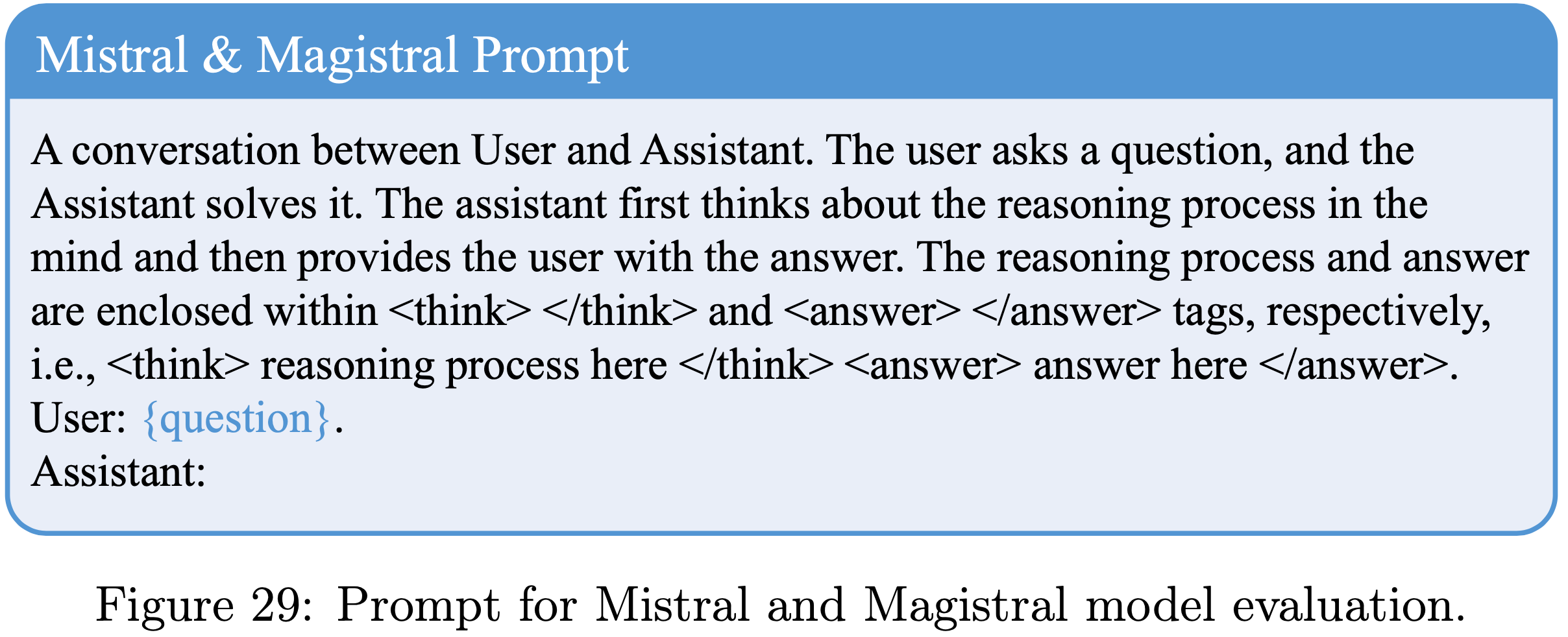 • 对于在 AIME24/25 上评估 Mistral 和 Magistral 模型, Prompt 如图 29 所示