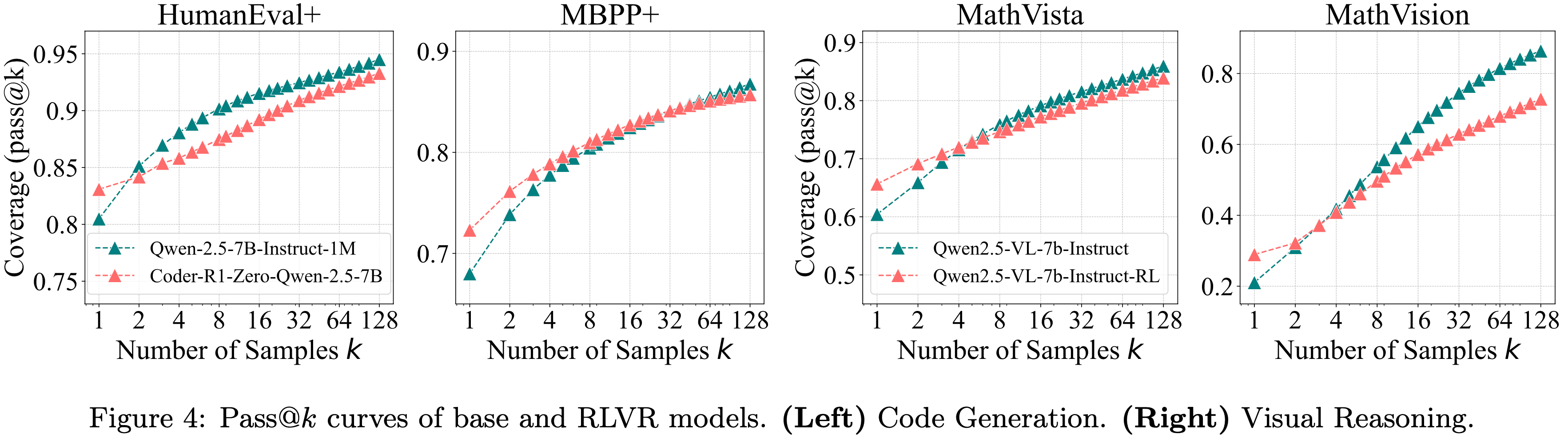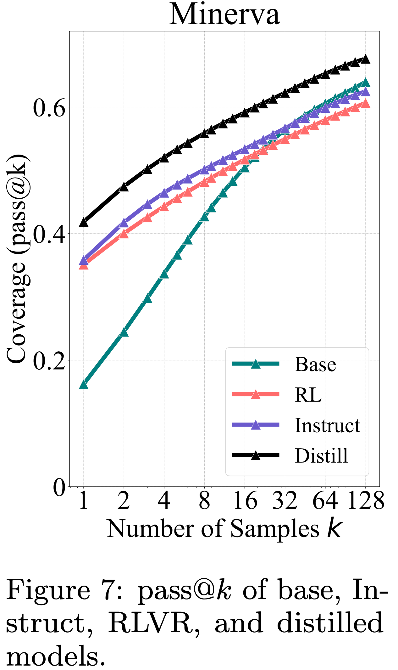 • 图 2 : Base Model 及其 RLVR 训练对应模型在多个数学基准测试上的 Pass@\(k\) 曲线