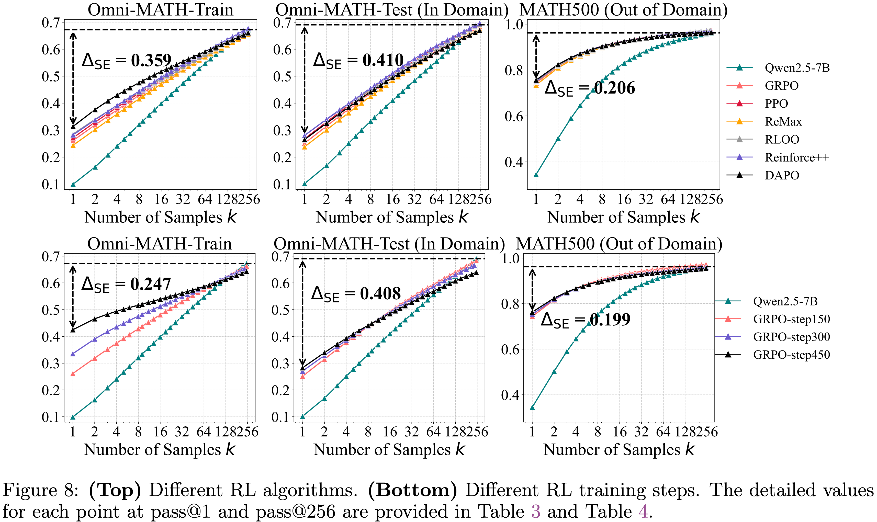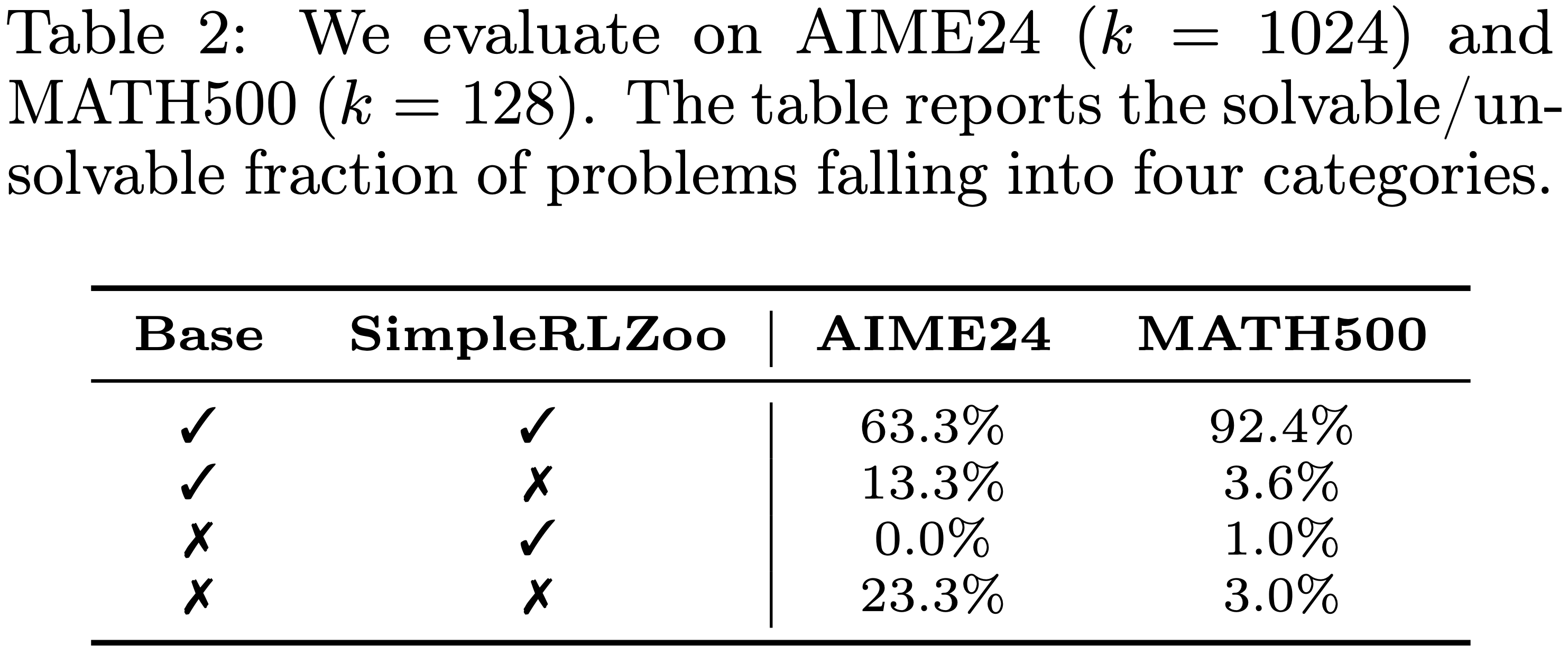 • 这为 RLVR 训练是否能产生根本性的超越能力、使模型能够解决 Base Model 无法解决的问题提供了严格检验