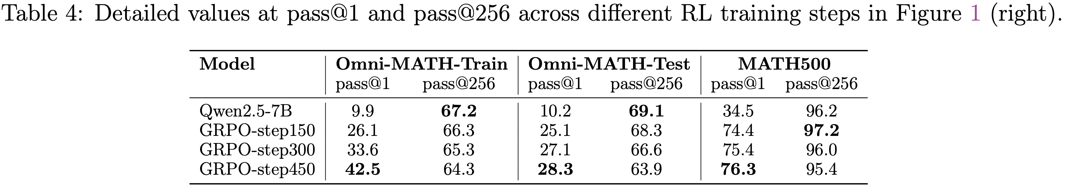 • 表 4:图 1(右)中不同 RL 训练步骤在 pass@1 和 pass@256 的详细数值