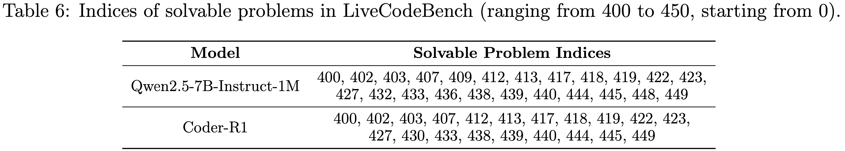 • 表 6:LiveCodeBench(范围从400到450,从0开始)中可解决问题的索引