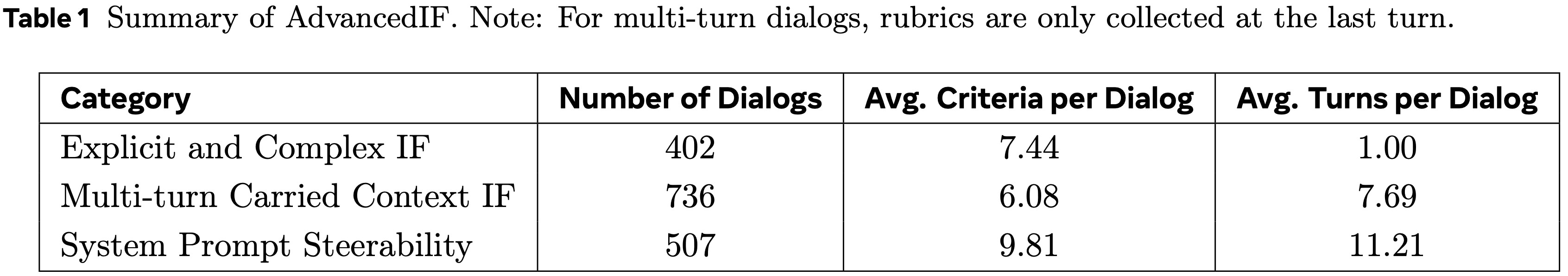 - 表 1 中展示了 AdvancedIF 的基本统计信息
