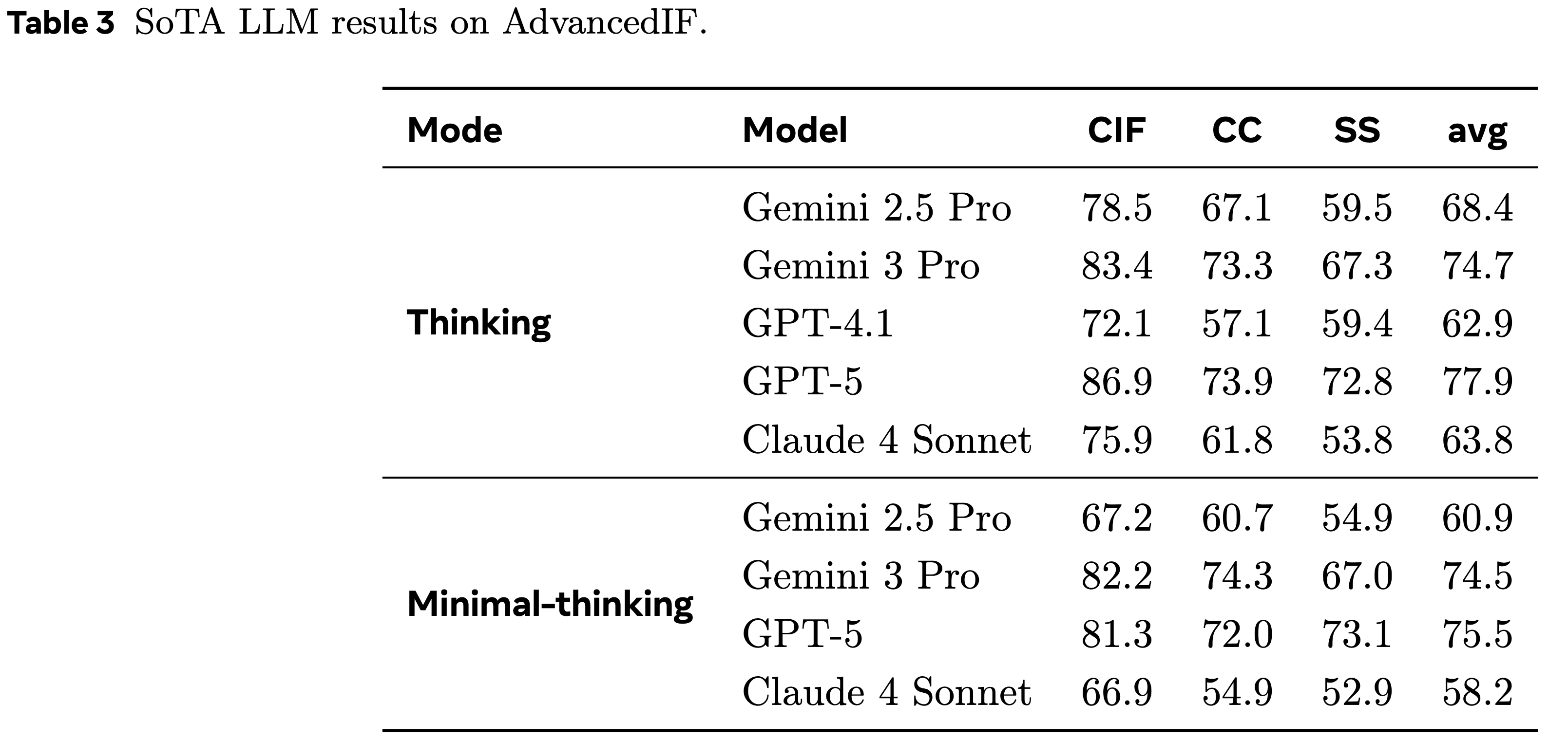 - 论文对诸如 GPT5、Gemini 2.5 Pro 和 Claude-4-Sonnet 等 SoTA LLM 进行了基准测试,它们取得的最佳结果大约在 70% 左右,这表明 AdvancedIF 相当具有挑战性,并能更好地反映现有 LLM 与理想目标之间的差距