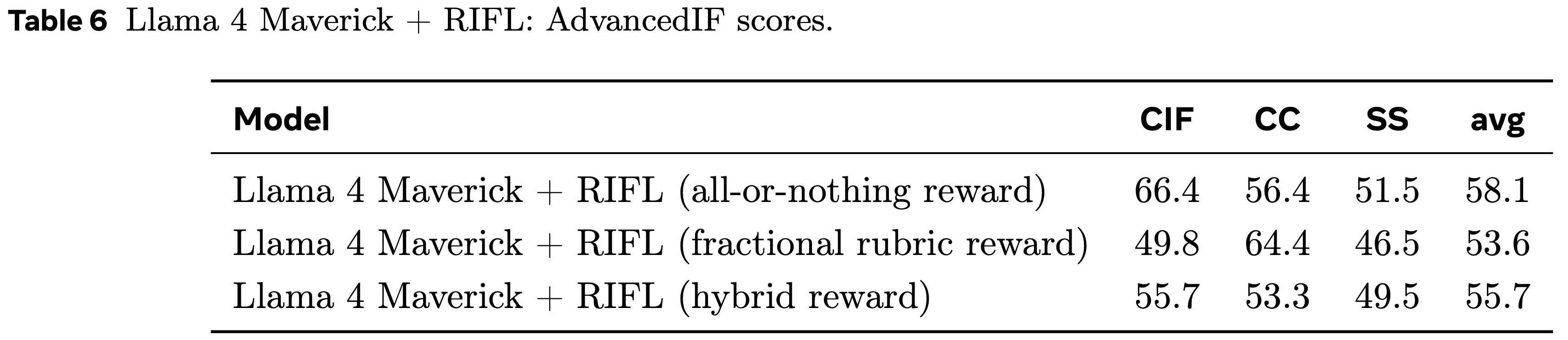 - RIFL 显著提升了 Llama 4 Maverick 在各种具有挑战性的基准测试上的指令遵循能力