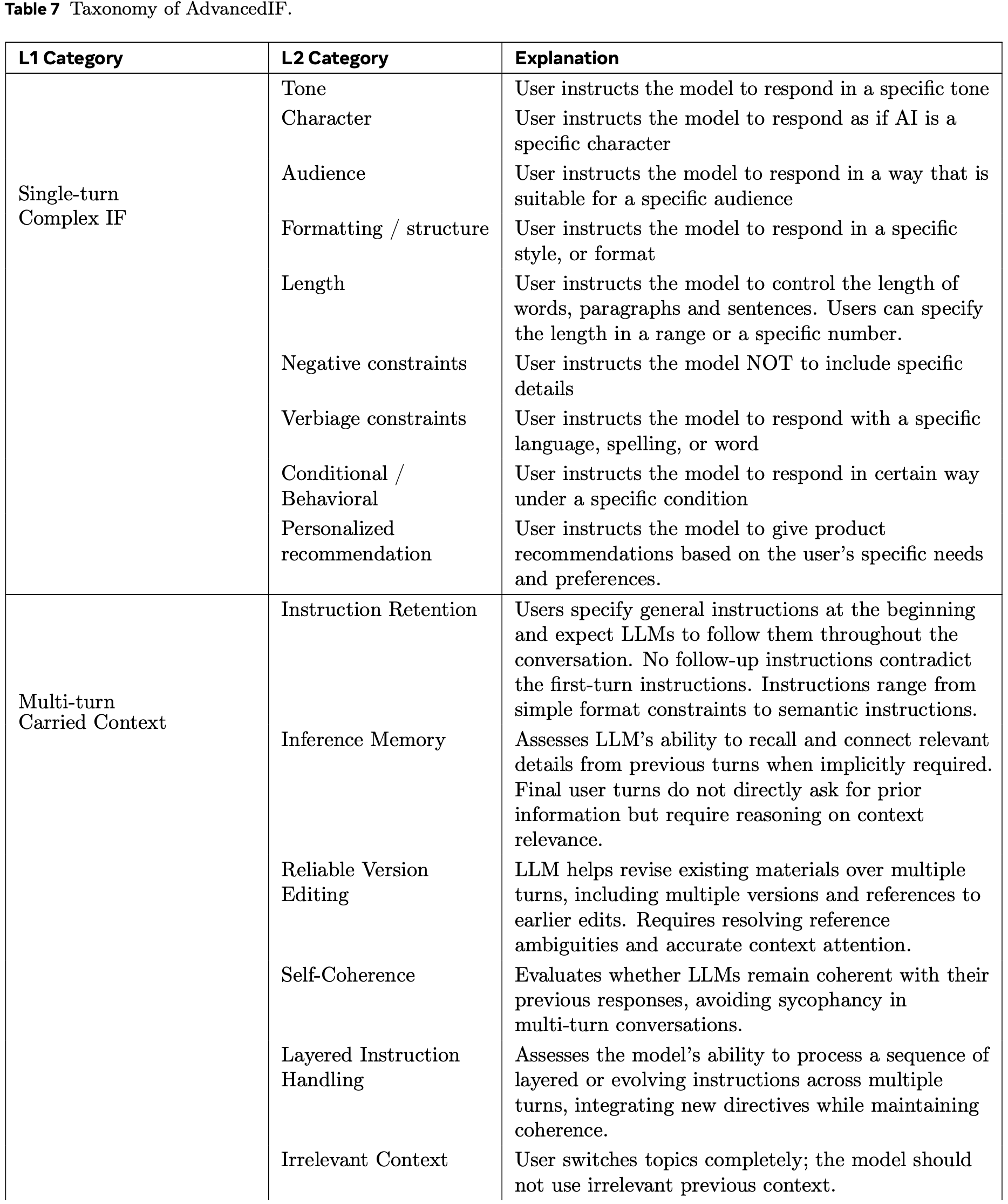 - (a) 复杂指令遵循(Complex instruction following) :每条 Prompt 有 6 条以上的指令,结合了语气、格式、风格、结构、长度、否定约束、拼写和条件间指令;