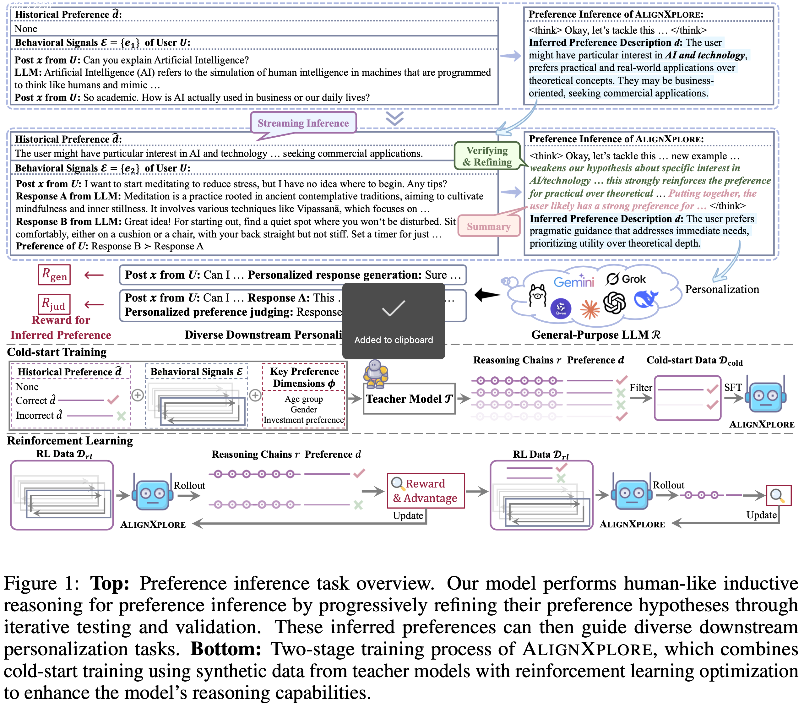 - AlignXplore 是一种利用扩展推理链从用户交互历史中的行为信号中系统推断偏好的模型