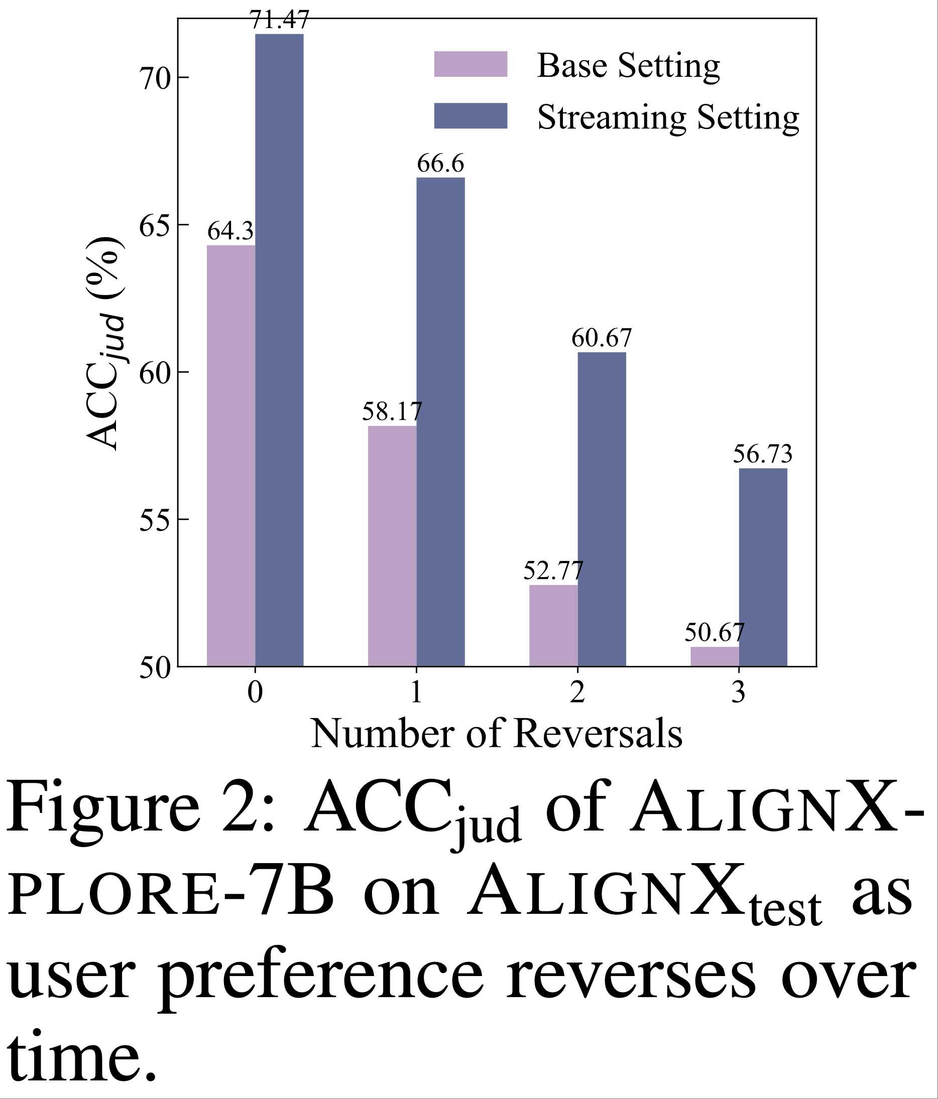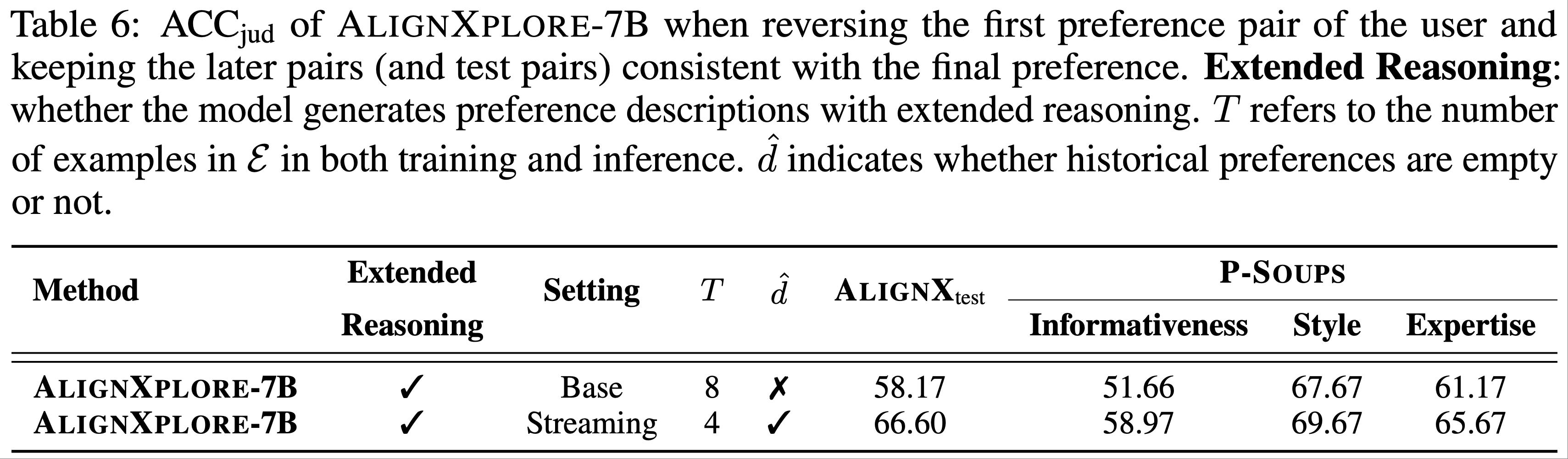 - 表 6 展示了 AlignXplore-7B 在基础设置和流式设置下,当为每位用户提供 8 个偏好对且第一个偏好对反转时的性能