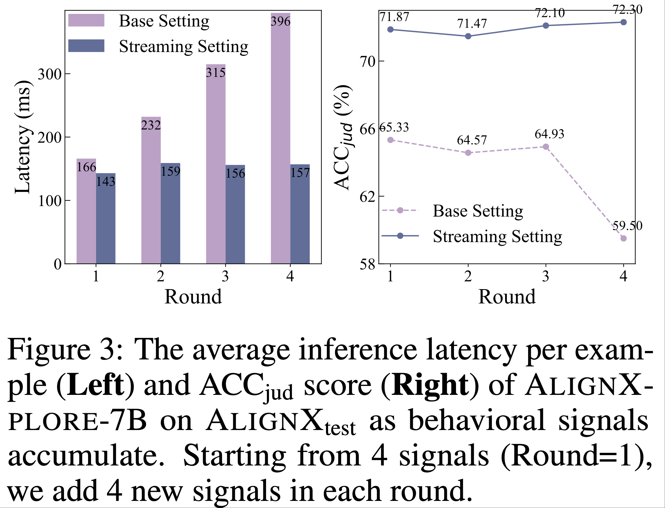 - AlignXplore 的流式推断机制通过避免重复计算实现了对增长行为信号的高效处理,同时允许逐步优化推断的偏好,从而获得更好的性能