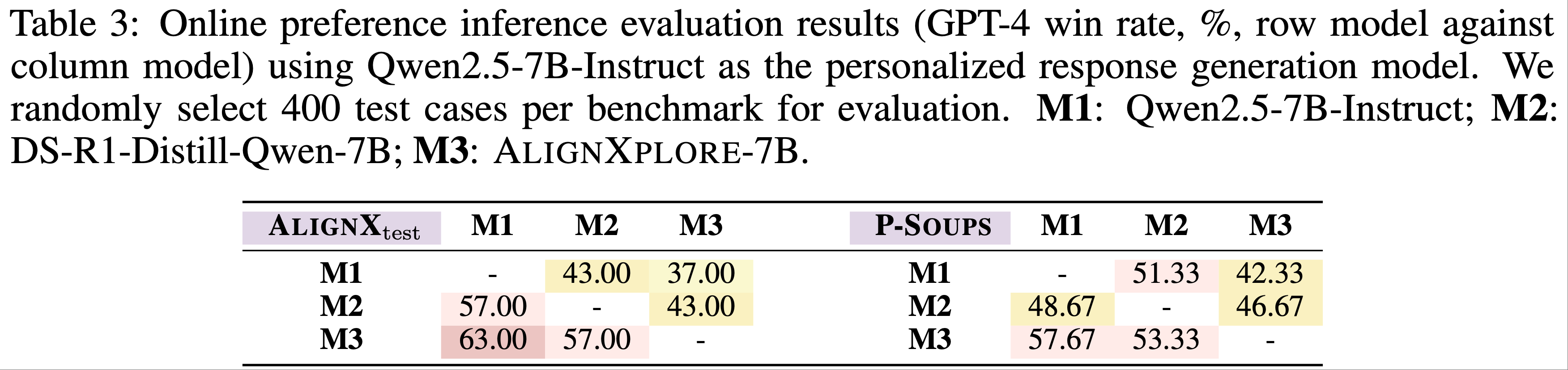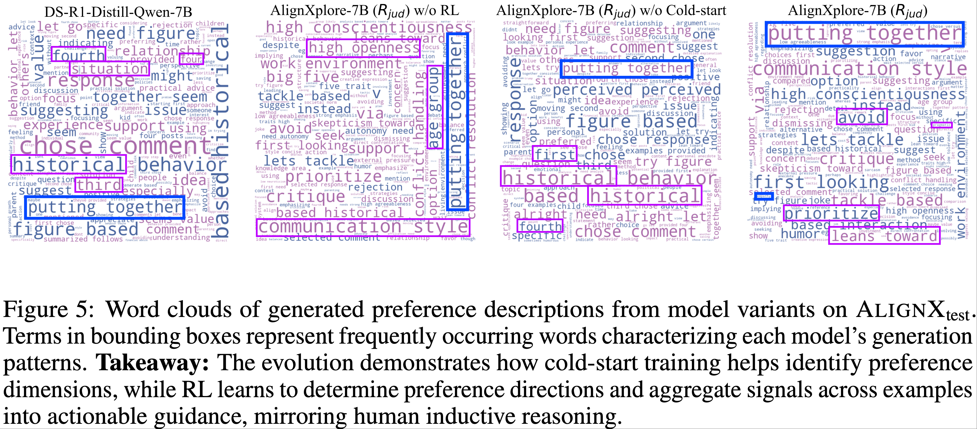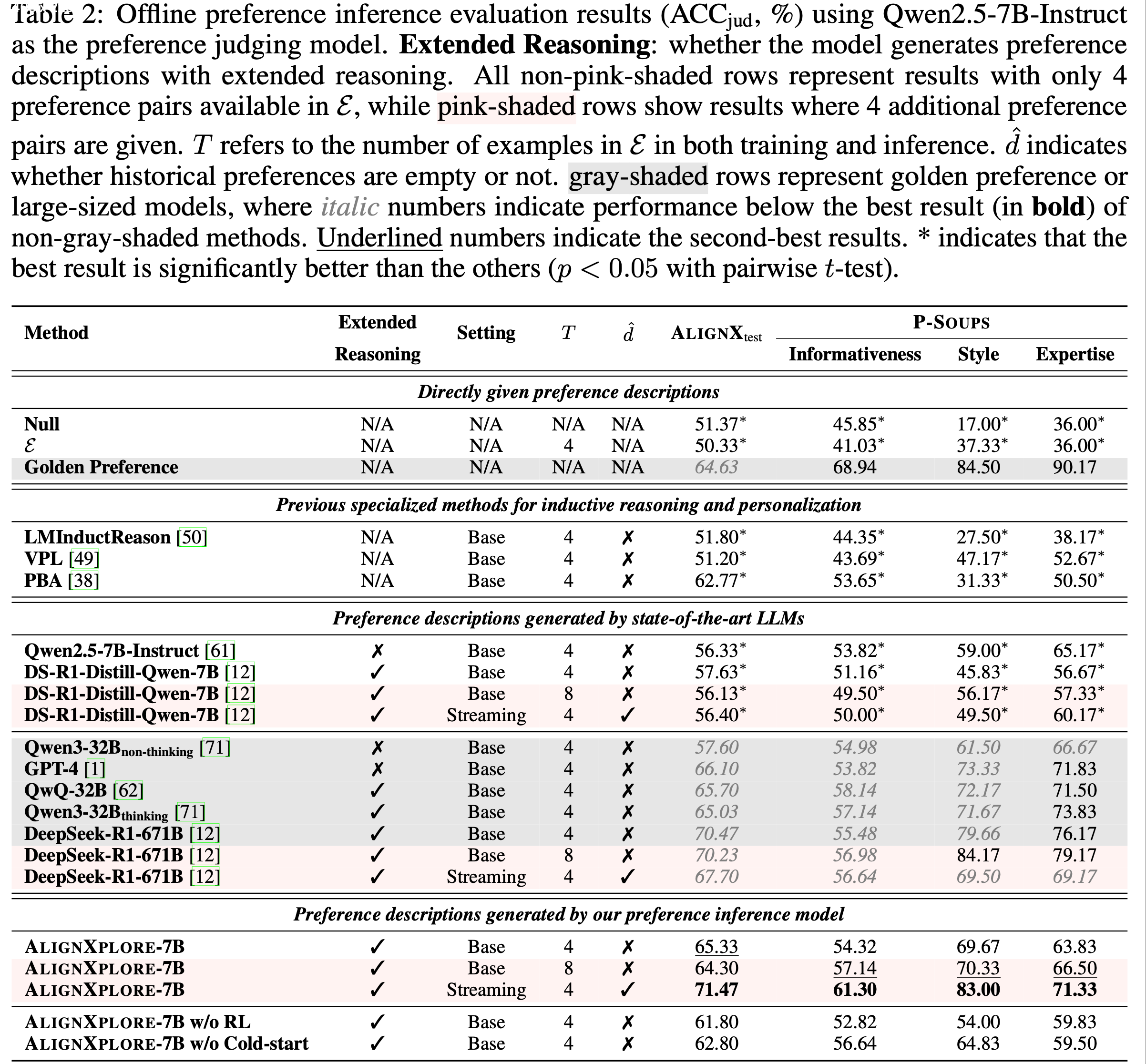 - 此外,为验证方法的有效性,论文还比较了 AlignXplore-7B 的消融版本(w/o RL 和 w/o Cold-start),分别在基础设置下仅使用冷启动训练或强化学习进行偏好推断