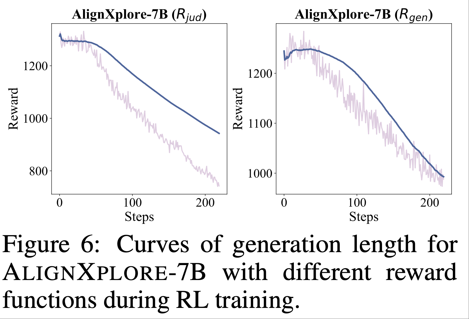 - 图 6 展示了 AlignXplore-7B(\(R_{\text{jud} }\))和 AlignXplore-7B(\(R_{\text{gen} }\))在强化学习过程中生成长度的变化