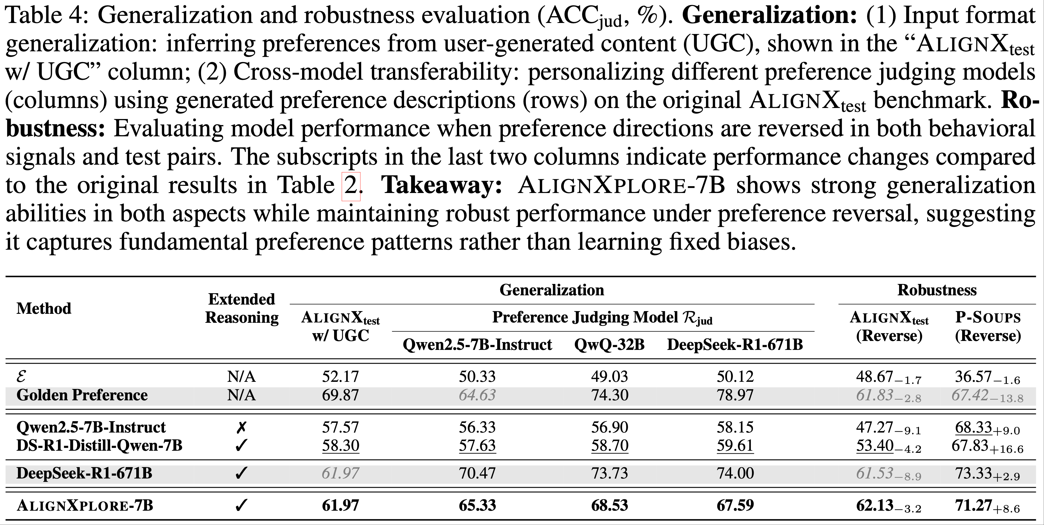 - AlignXplore 还展示了在不同输入格式和下游模型中的强大泛化能力,并在偏好反转时保持了稳健的性能