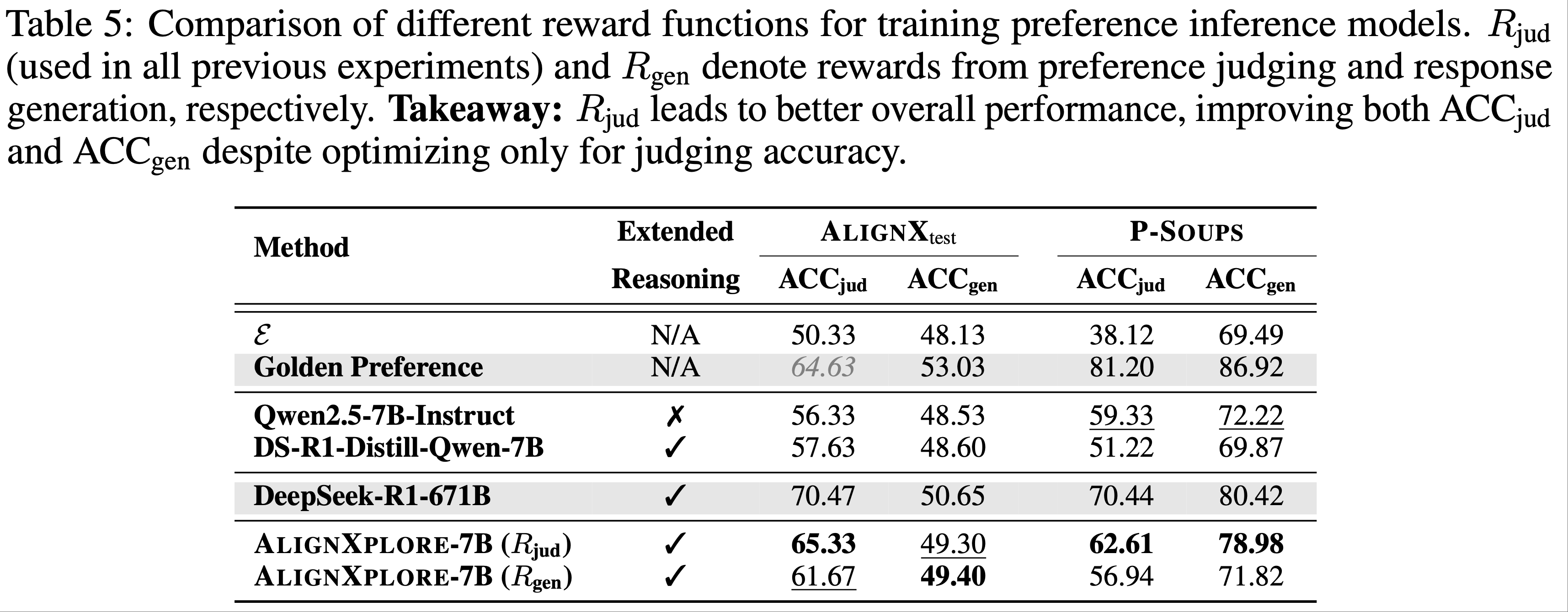 - 结果显示,\(R_{\text{jud} }\) 在多数指标上表现更优,甚至包括响应生成(\(\text{ACC}_{\text{gen} }\)),表明直接优化偏好判断能提供更稳定的训练信号