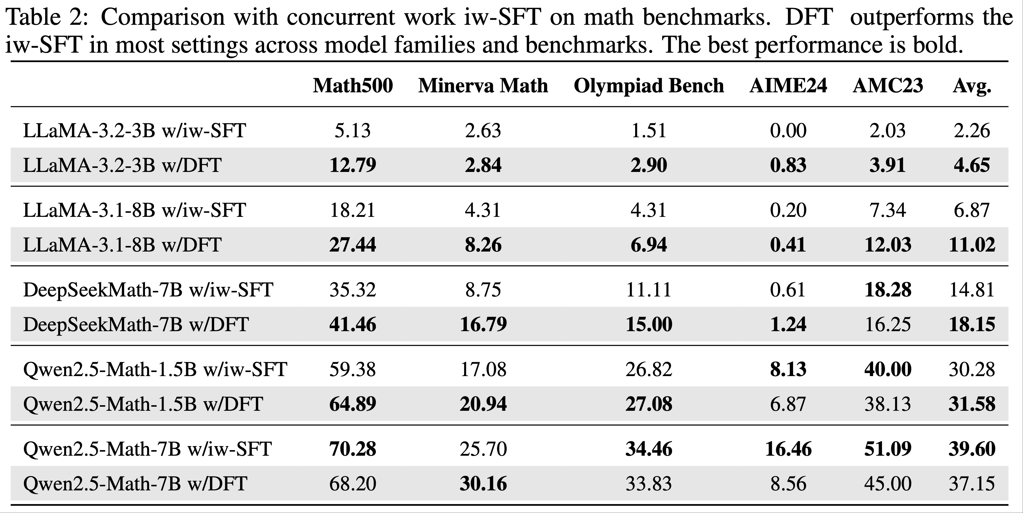 - DFT 仅仅修改了一行代码,在 SFT 的损失函数上加入一个权重,得到了大幅的泛化能力提升