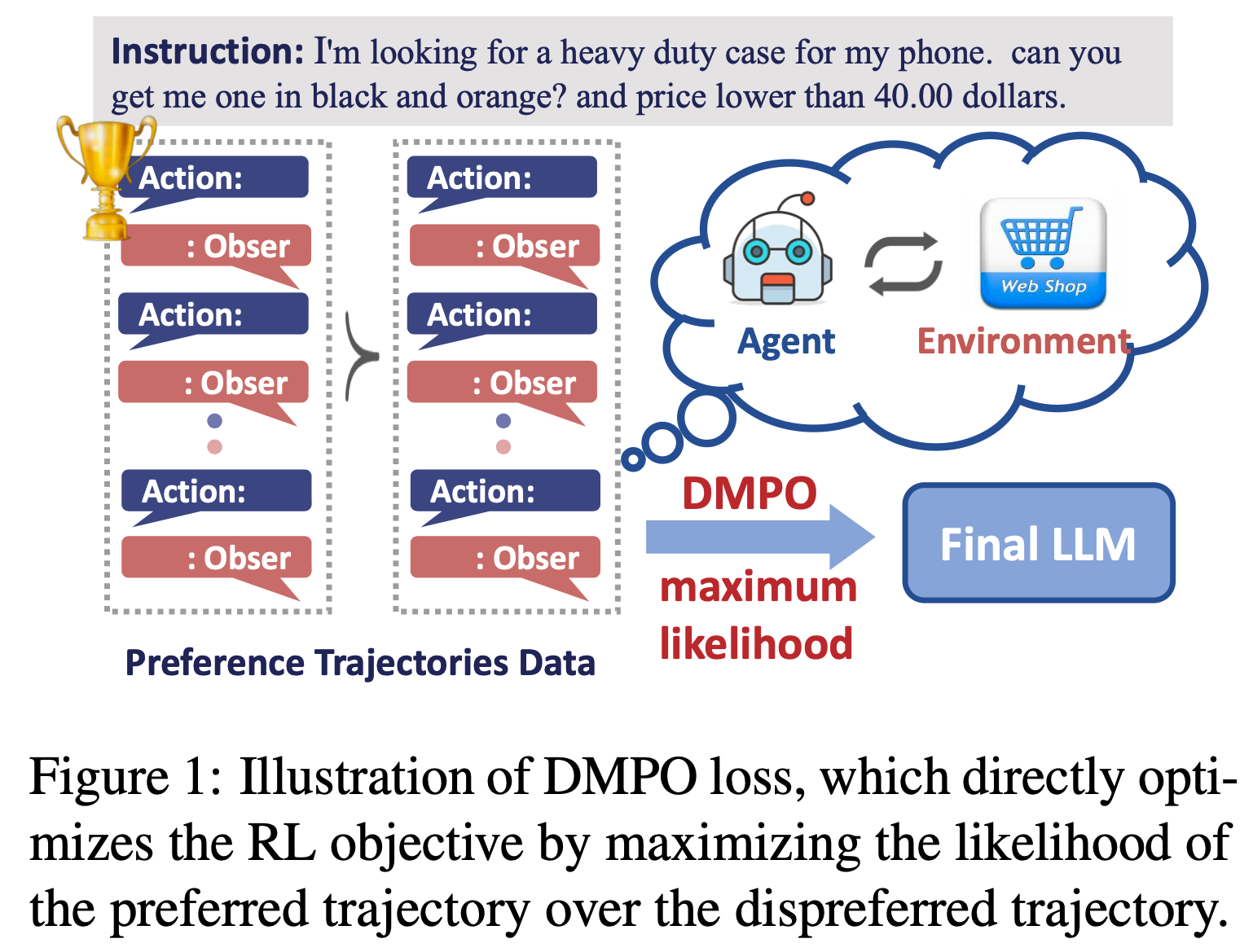 • 如图1 所示,DMPO 通过最大化偏好(“win”)轨迹相对于非偏好(“loss”)轨迹的似然,直接优化强化学习目标
