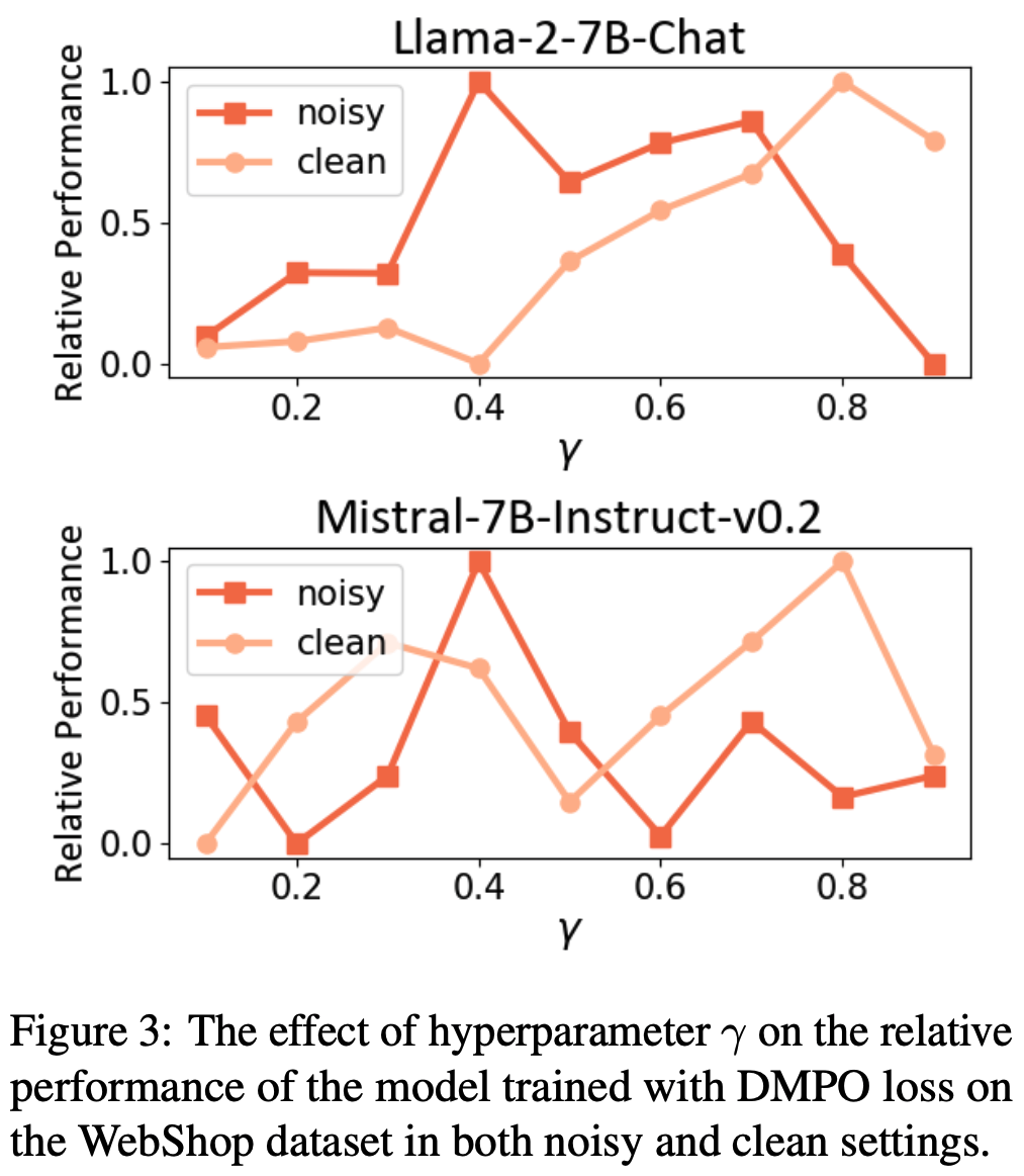 • 超参数分析 :为了验证公式(17)中重加权函数 \(\phi(t,T)\) 的影响,论文在 WebShop 上调整超参数 \(\gamma\),结果如图3 所示。论文发现,在噪声设置中,较小的 \(\gamma\) 能使两个基础模型达到最佳性能;而在干净设置中,较大的 \(\gamma\) 表现更优。根据公式(17),较小的 \(\gamma\) 意味着 DMPO 损失函数对后期步骤的状态-动作对赋予较低权重。这表明 DMPO 可以通过调整参数 \(\gamma\) 平衡噪声的影响。面对噪声“lose”轨迹时,选择较小的 \(\gamma\) 可以减轻噪声影响;而面对高质量“lose”轨迹时,选择较大的 \(\gamma\) 可以更好地从后期状态-动作对中学习策略