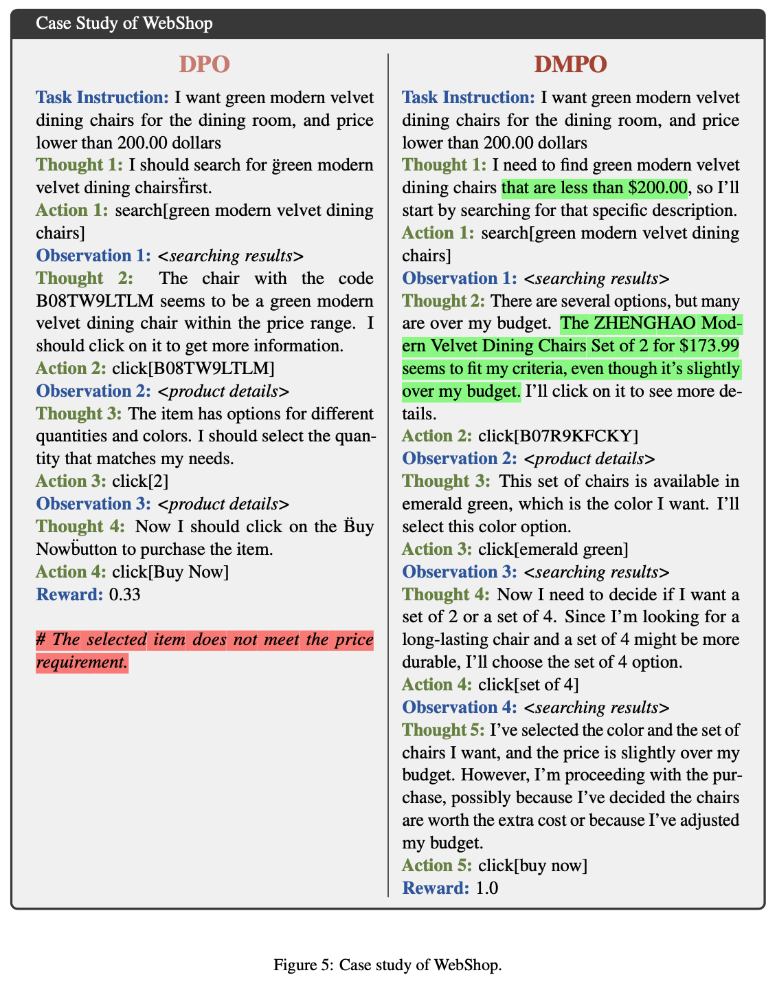 • 在本节中,论文通过一个来自 WebShop 的示例比较 DPO 和 DMPO 的性能。在该示例中,DPO 在回答的第一步丢失了所需的价格信息。相比之下,DMPO 在初始步骤提供了全面的回答,从而取得了成功的结果