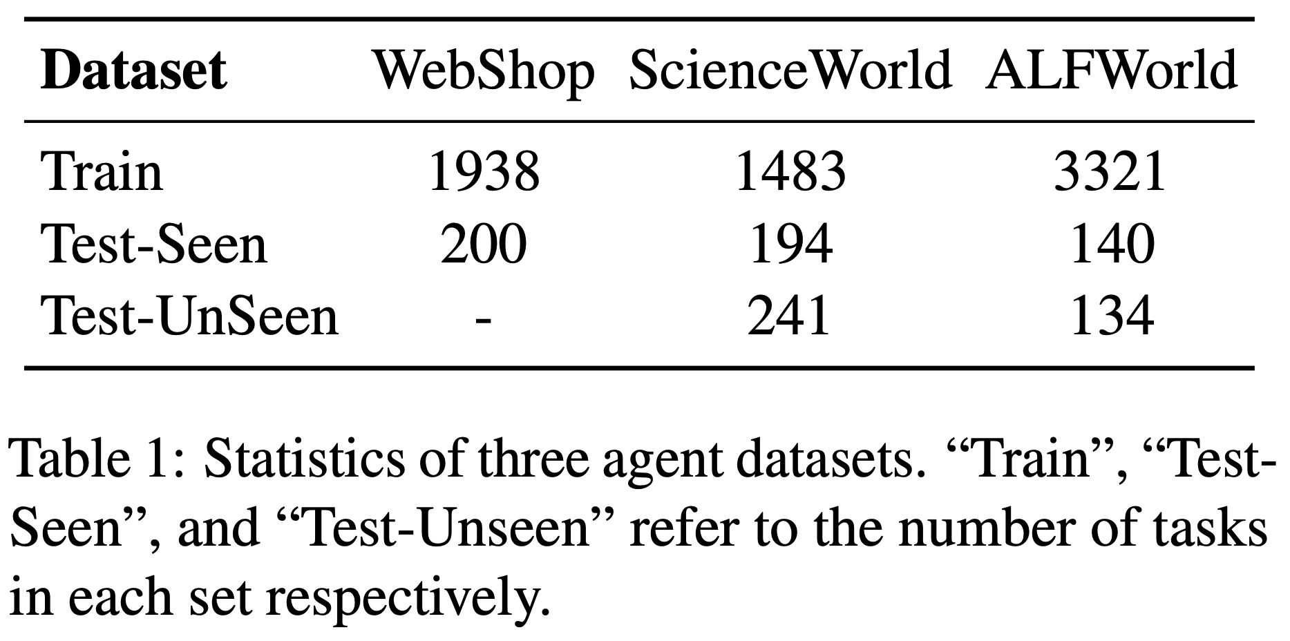 这三个环境均可形式化为马尔可夫决策过程(MDP),并由语言智能体执行。数据集的统计细节如表1 所示。遵循 Song 等 (2024),除了分布内的“已见”测试集外,ScienceWorld 和 ALFWorld 还包含分布外的“未见”测试集,用于评估不同智能体的泛化能力