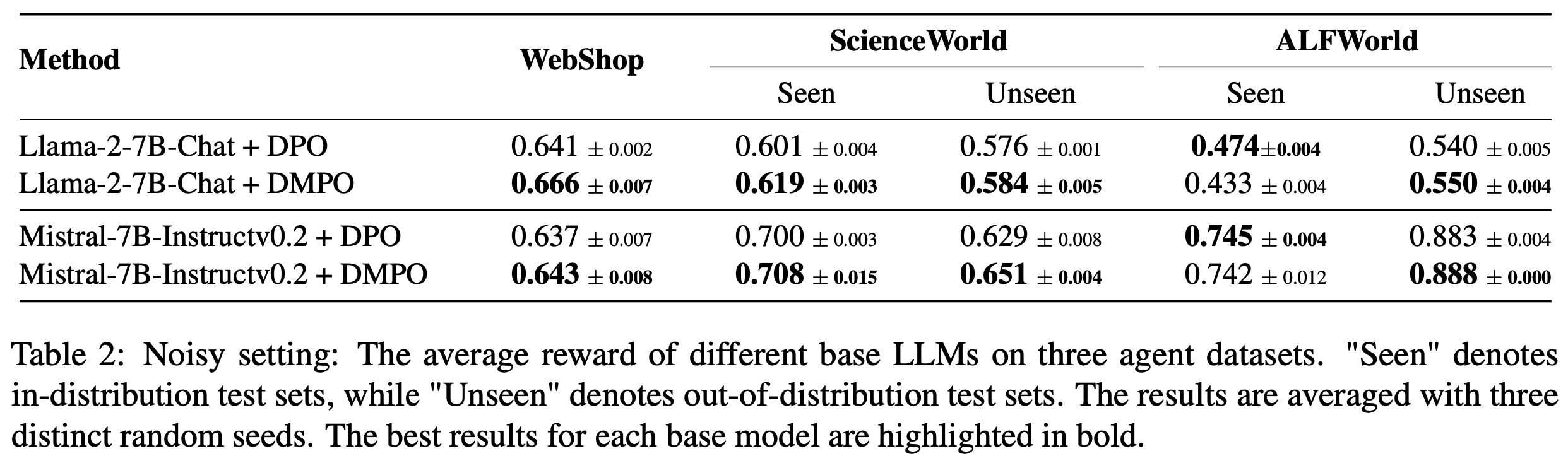 • Mistral-7B-Instruct-v0.2 在 ScienceWorld 和 ALFWorld 上的表现显著优于 Llama-2-7B-Chat。这表明基础模型的有效性与使用 DMPO 损失函数微调后的性能提升呈正相关