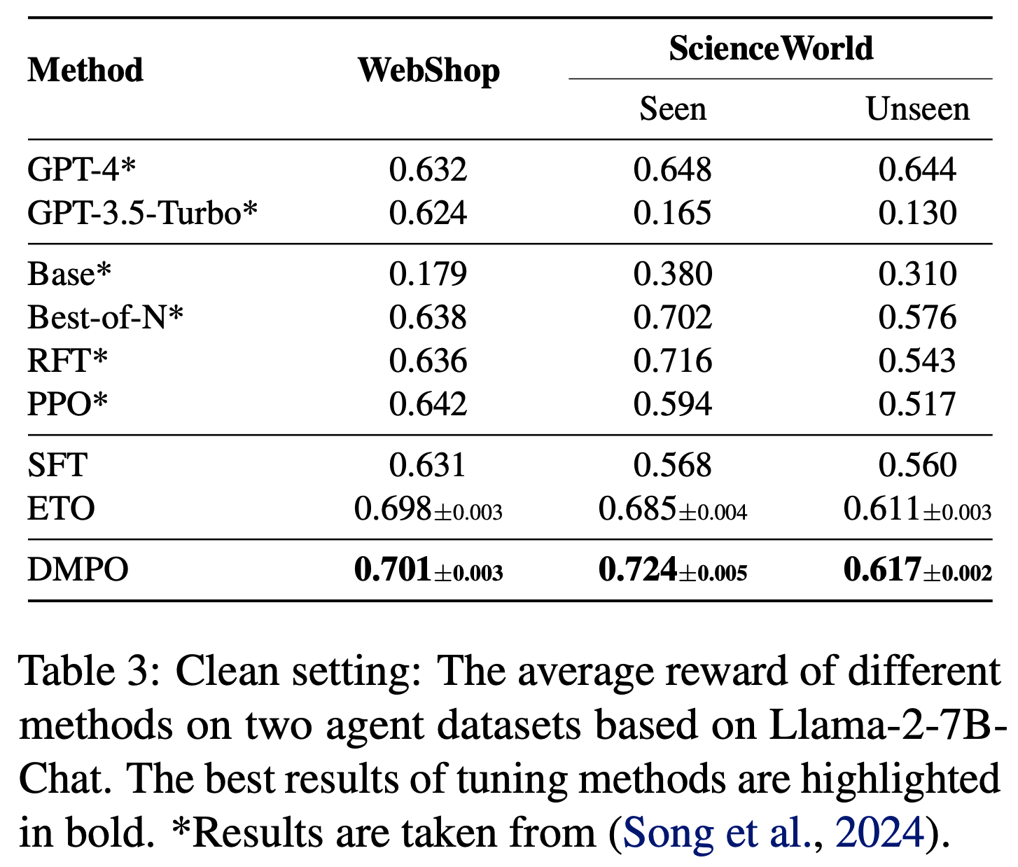 6) ETO(基于探索的轨迹优化,Song 等, 2024):通过迭代探索环境增强训练偏好数据,并使用 DPO 损失从偏好数据中学习