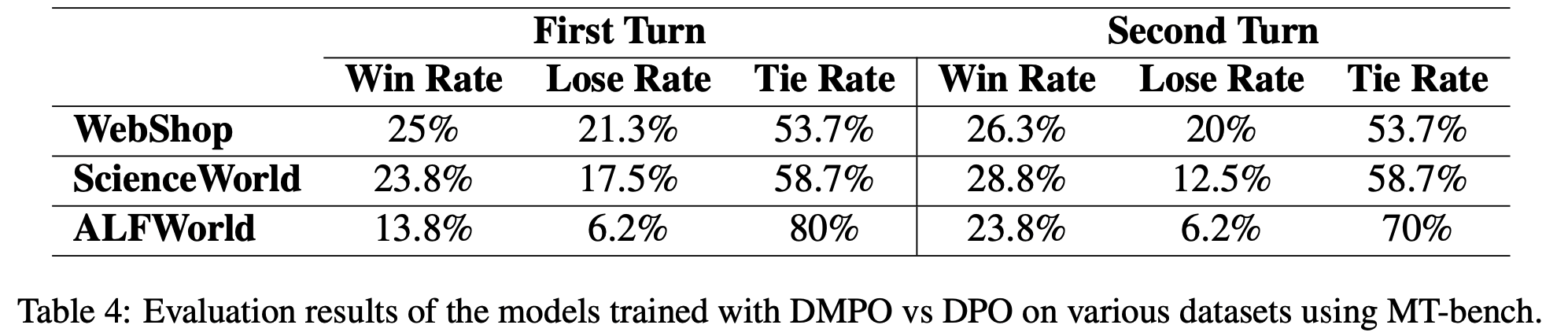 • 表中胜率分析表明,DMPO 在 MT-bench 的所有训练数据集上均优于 DPO。值得注意的是,DMPO 在 MT-bench 的第二轮评估中胜率显著高于 DPO,这证明了 DMPO 的有效性