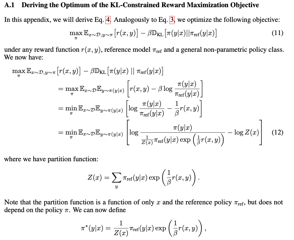 $$\pi_{r}(y \mid x)=\frac{1}{Z(x)}\pi_{\text{ref} }(y \mid x)\exp\left(\frac{1}{\beta}r(x,y)\right) \tag{4}$$