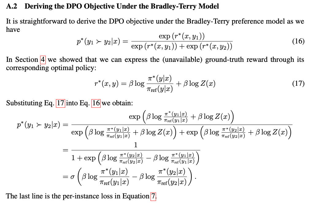 • 推导精髓:上述推导中消除了 \(Z(x)\) ,是通过引入 Bradley-Terry 偏好模型来实现的