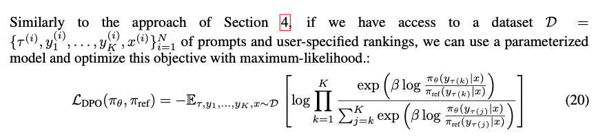 • 【与 RLHF Reward Model 训练相同】让人类对回答进行排序打分: \(y_a \succ y_b \succ y_c \succ y_d\) ,最终可获得数据集 \(D = \{x^{(i)}, y^{(i)}_w, y^{(i)}_l\}_{i=1}^N\)