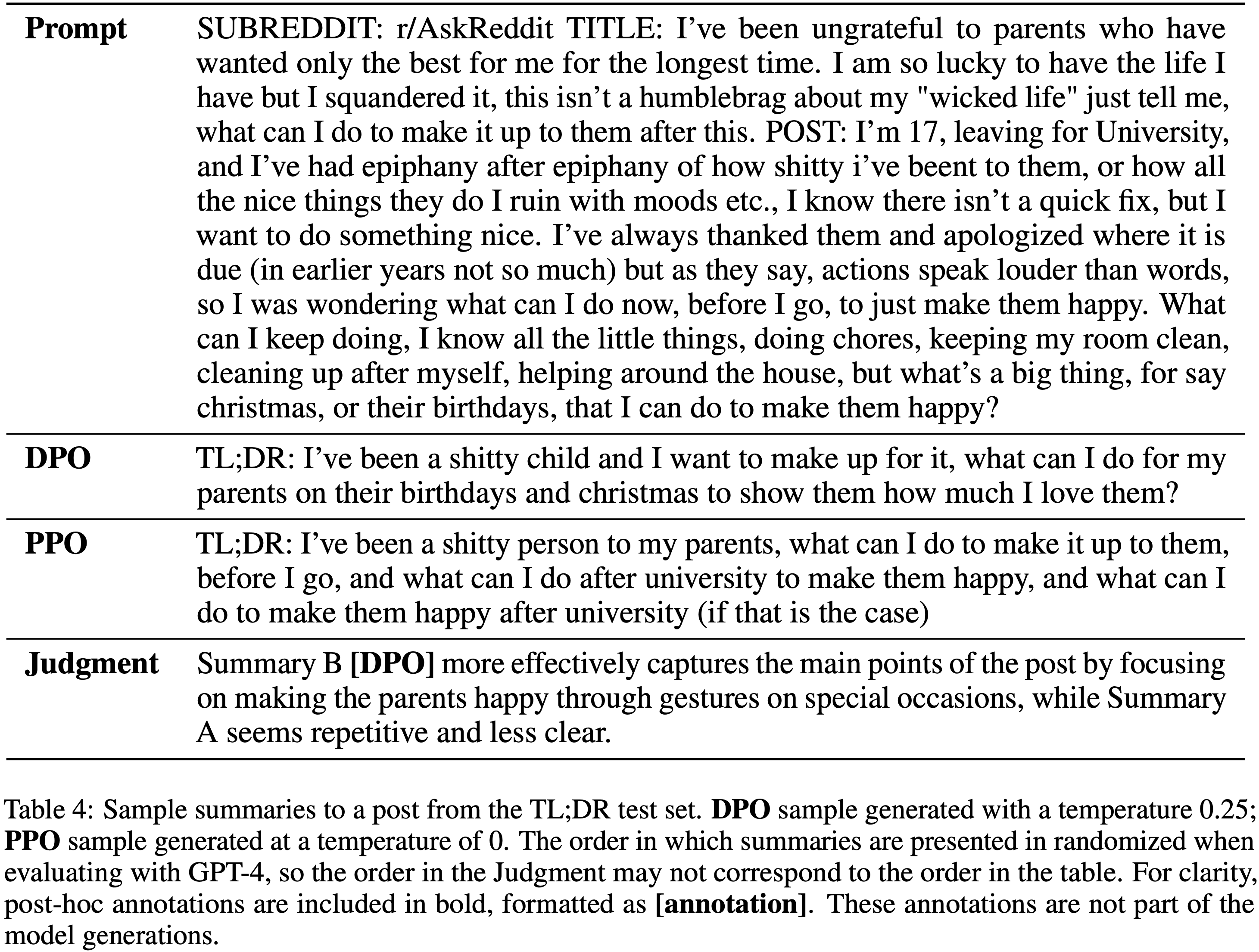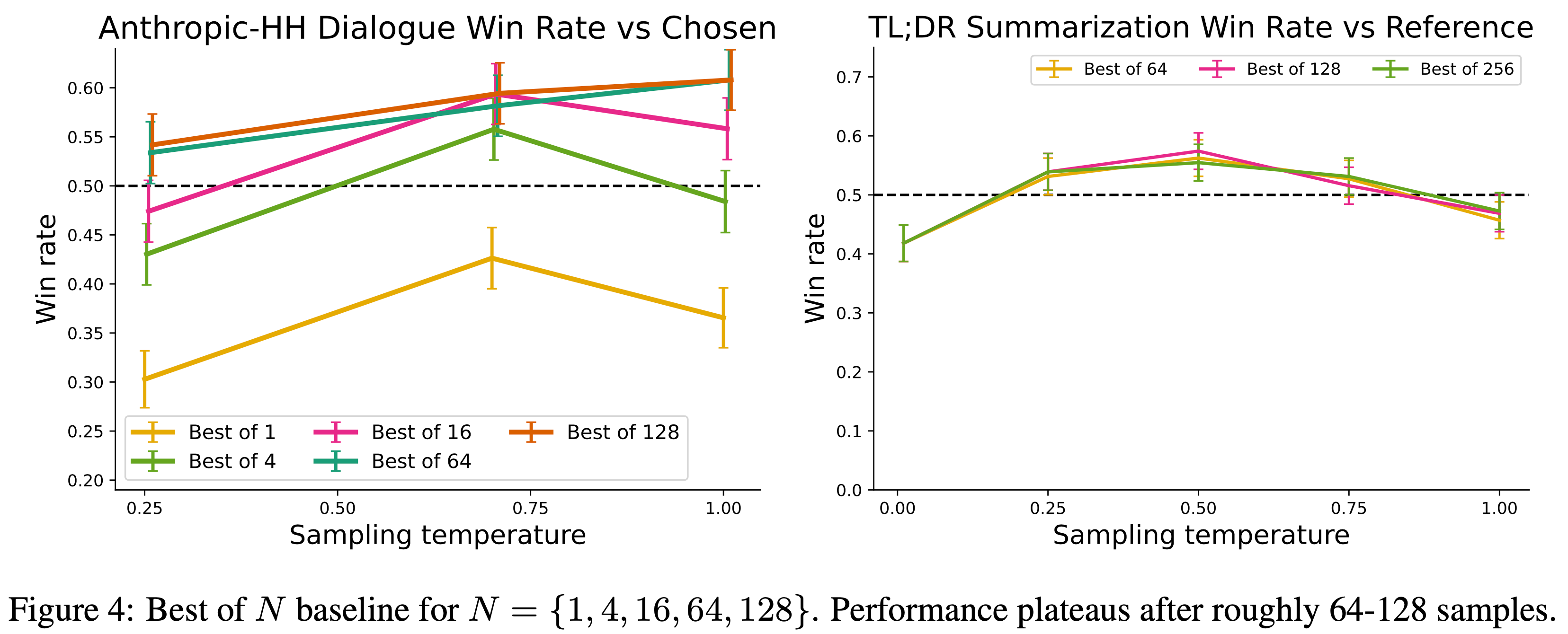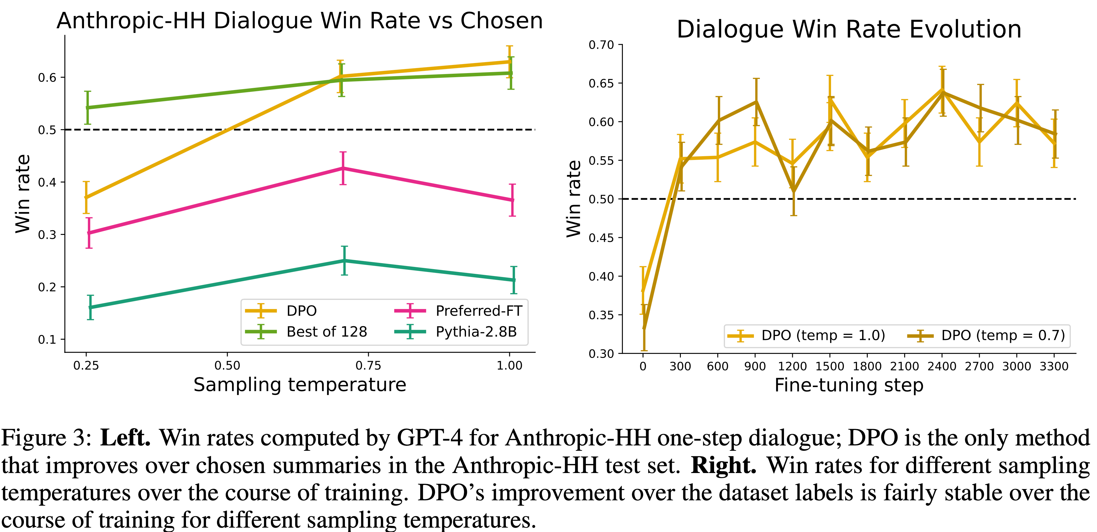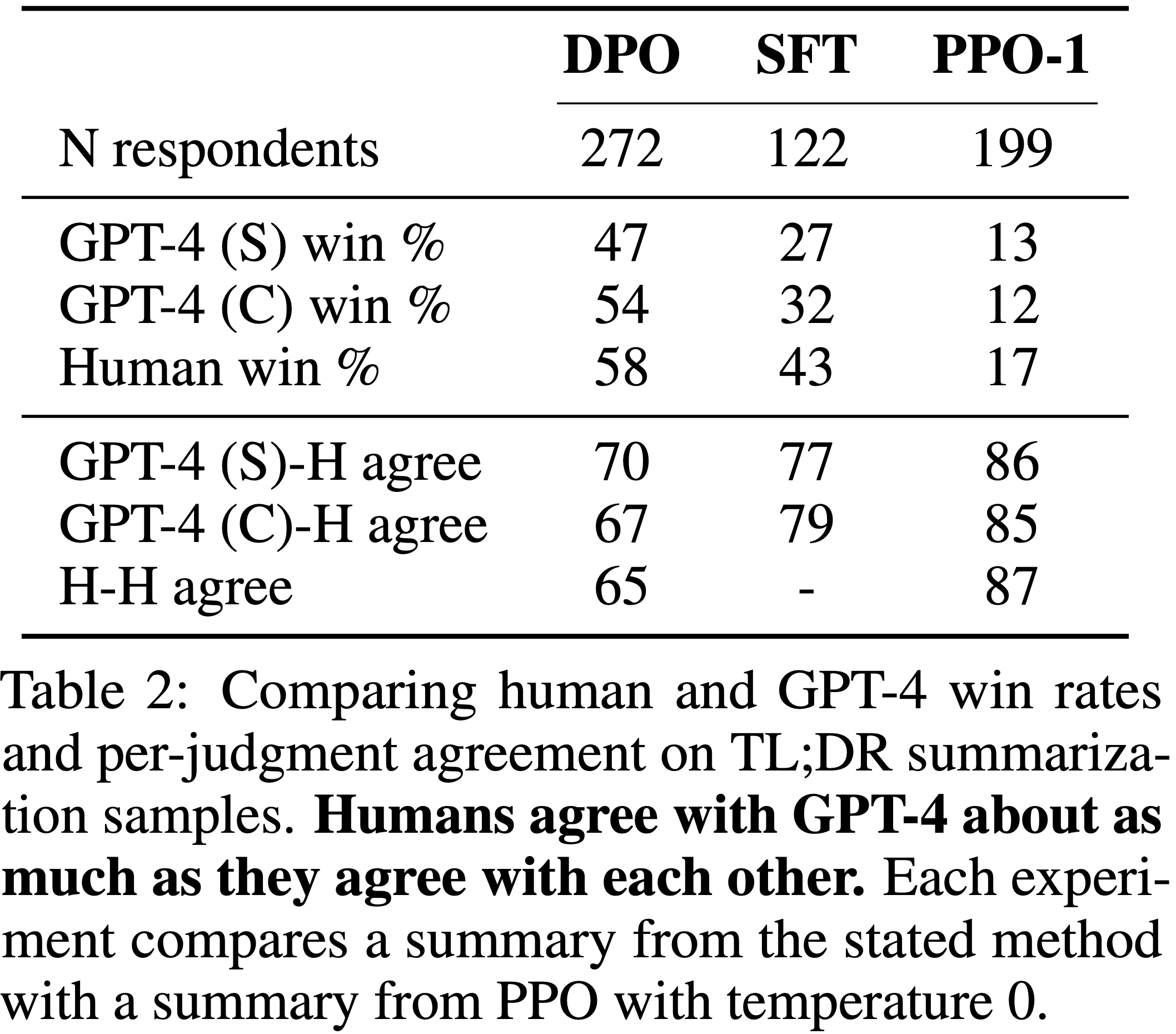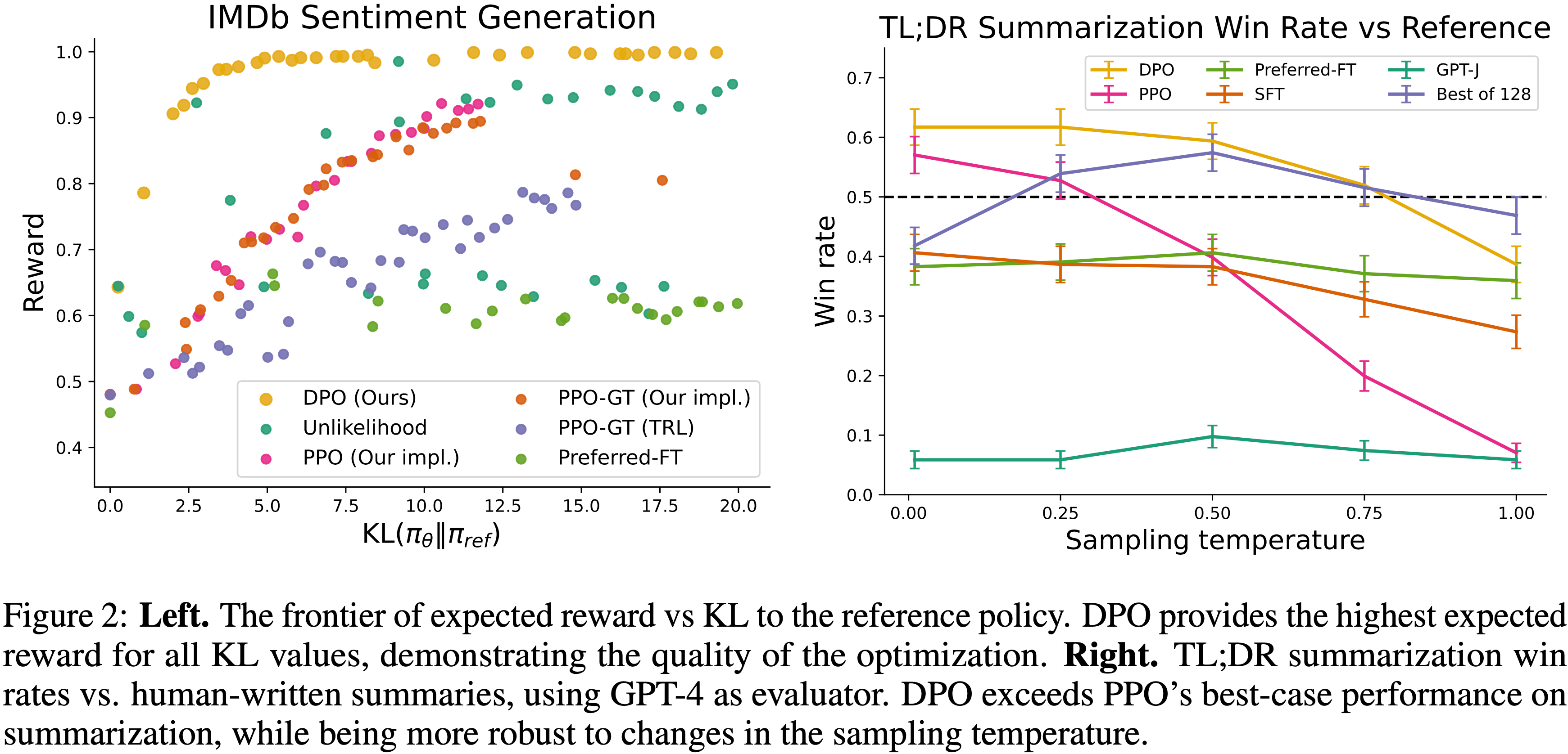 • 在作者的实验上,在几乎不需要调整超参数的情况下,DPO 的表现与现有的 RLHF 算法(包括基于 PPO 的算法)相当或更好;
