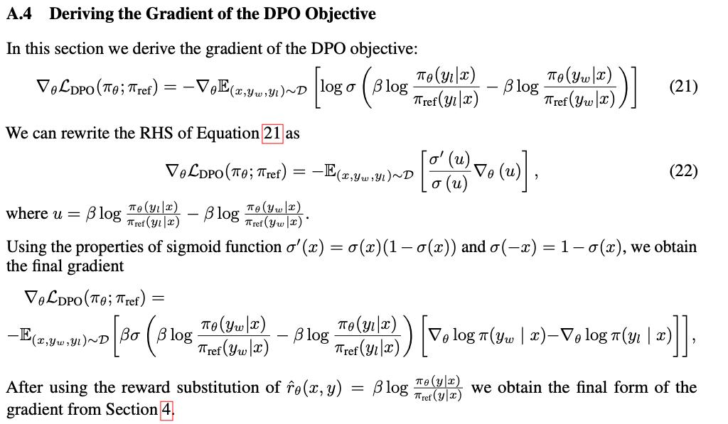• 其中 \(\hat{r}_\theta(x,y) = \color{red}{\beta} \log\frac{\pi_\theta(y|x)}{\pi_\text{ref}(y|x)}\)