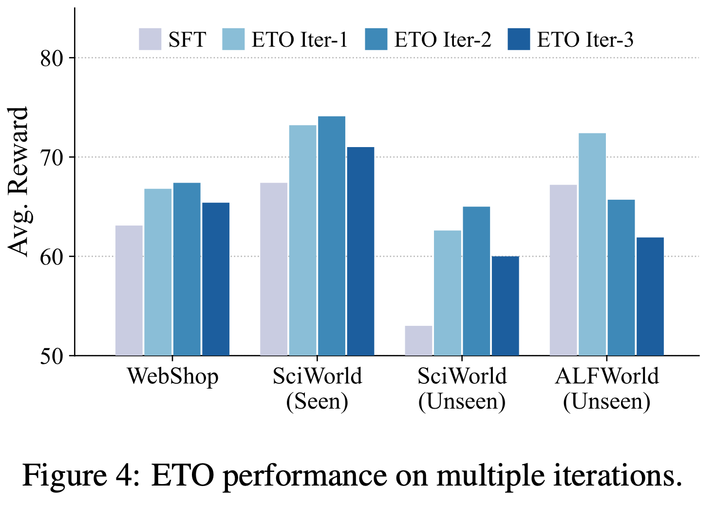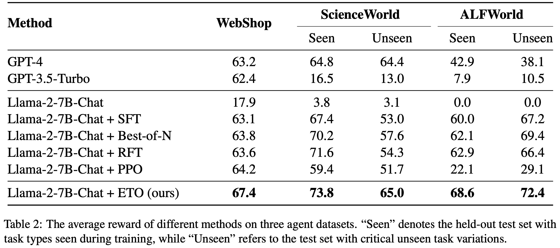 • 在这些数据集上,ETO 始终以显著优势超越 SFT 行为克隆和其他强基线方法,证明了从探索失败中学习的有效性