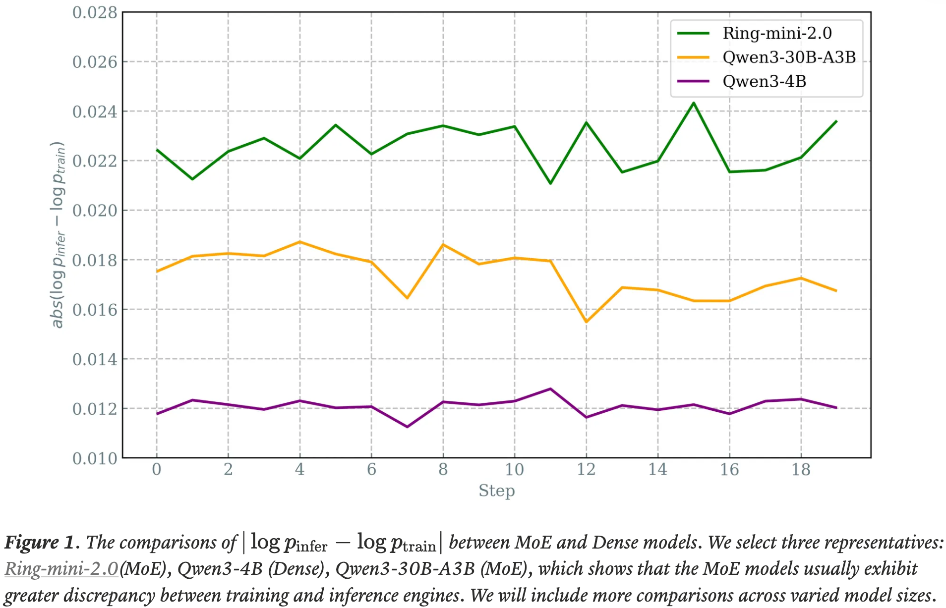 • 论文选择了三个代表性模型:Ring-mini-2.0 (MoE)、Qwen3-4B (Dense)、Qwen3-30B-A3B (MoE),这表明 MoE 模型通常在训练和推理引擎之间表现出更大的差异