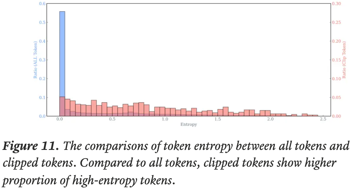 • 下面的图11 显示,与所有 Token 相比,被裁剪的 Token 表现出更高的熵,这表明被裁剪的 Token 在训练中扮演着重要角色
