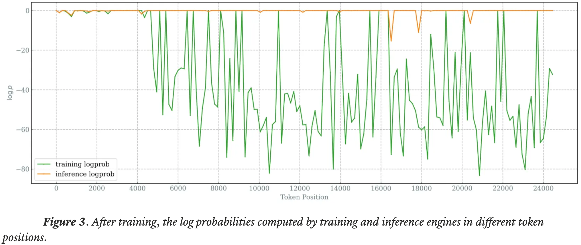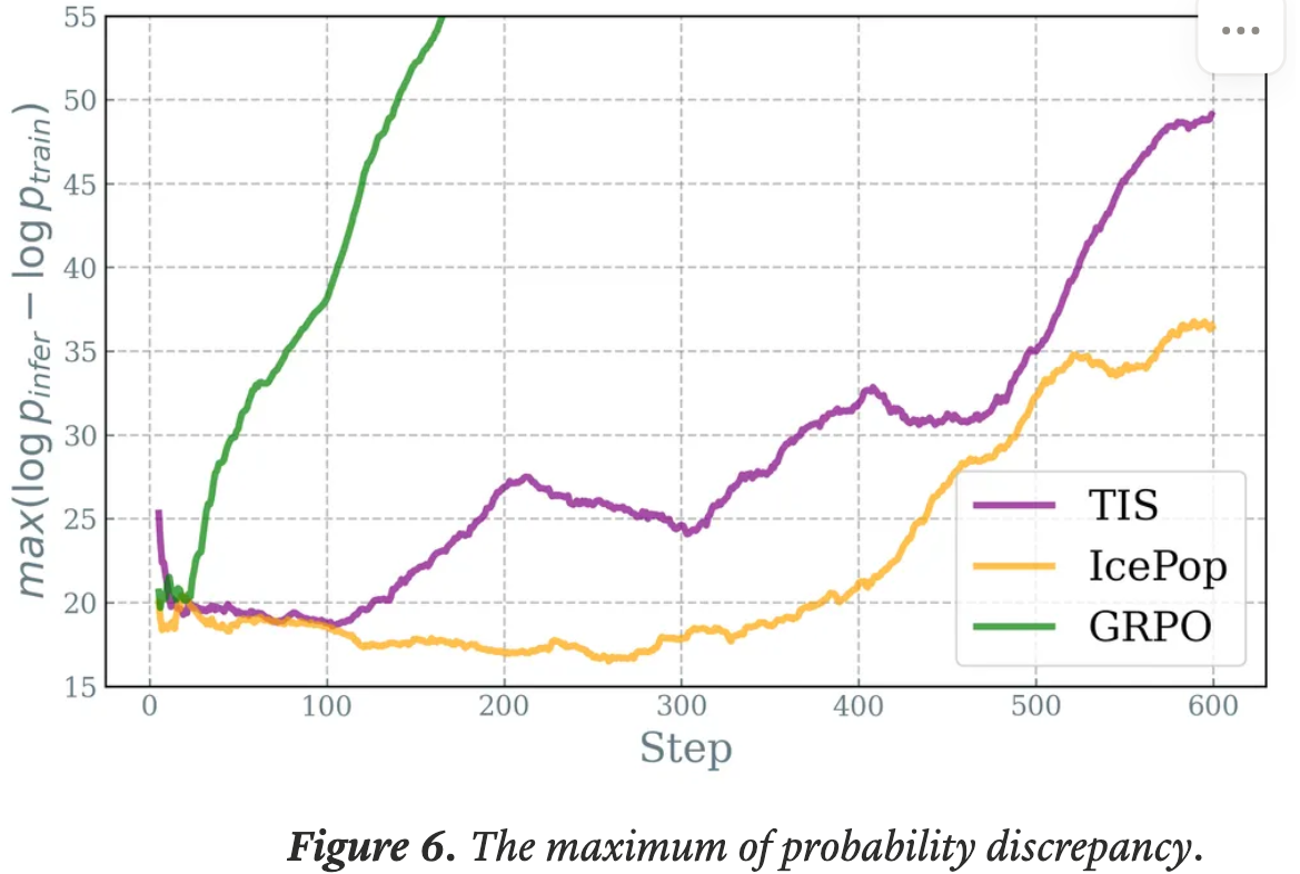 • 随着训练的进行,问题加剧:训练和推理引擎之间同一 Token 的概率差距在多个 Token 位置上持续增加,甚至影响到长序列中前面的 Token ,并使优化过程不稳定